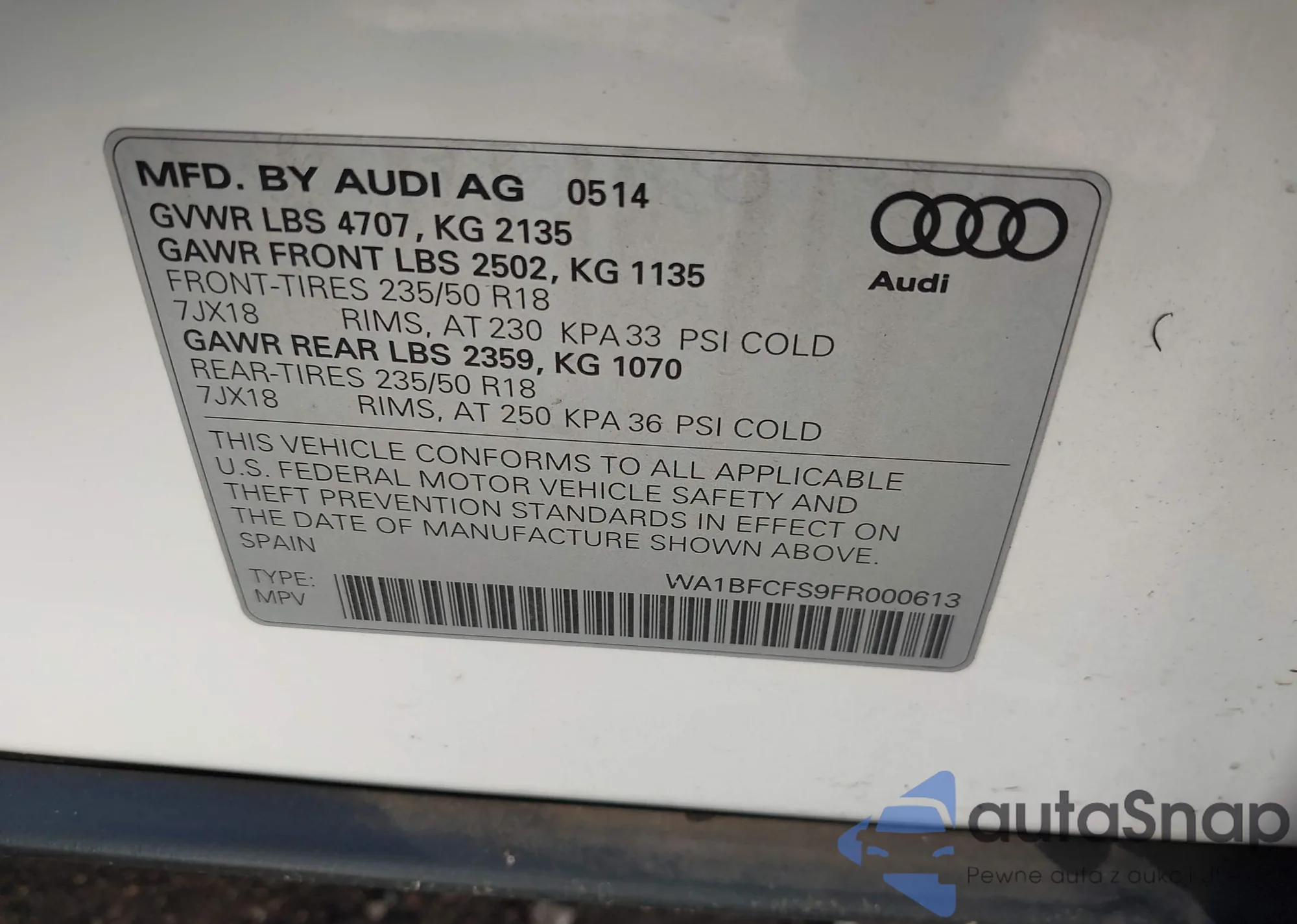 LOT: 43326044 VIN: WA1BFCFS9FR000613