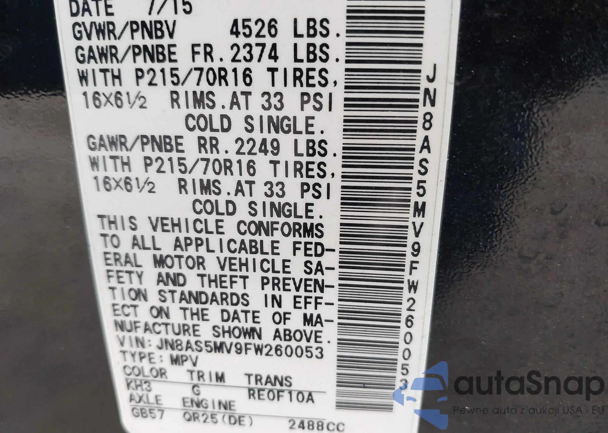 LOT: 43378313 VIN: JN8AS5MV9FW260053