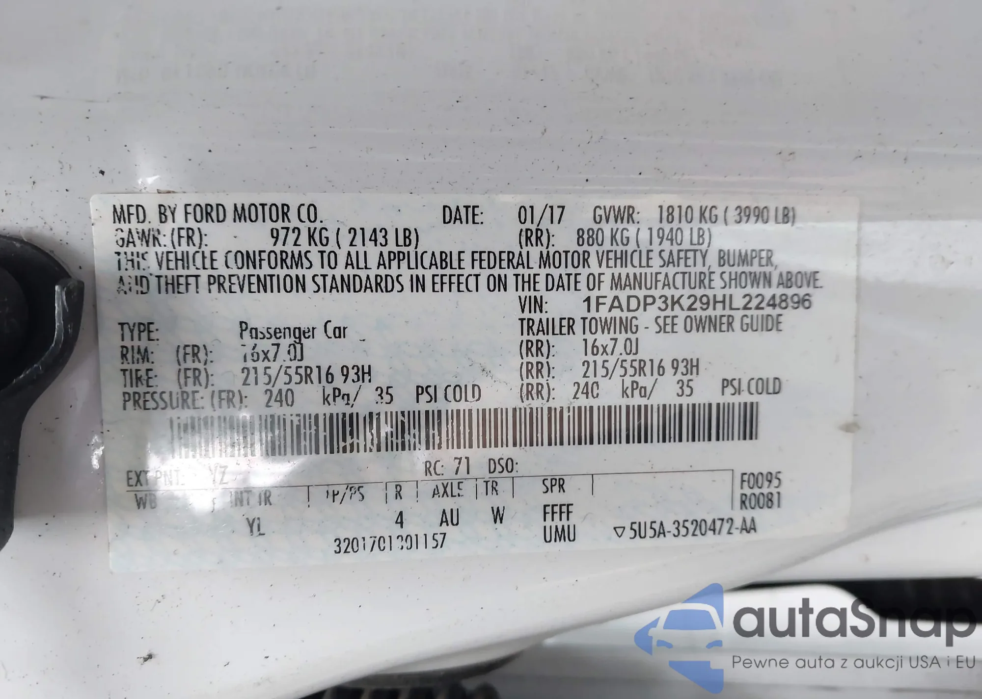 LOT: 43445422 VIN: 1FADP3K29HL224896