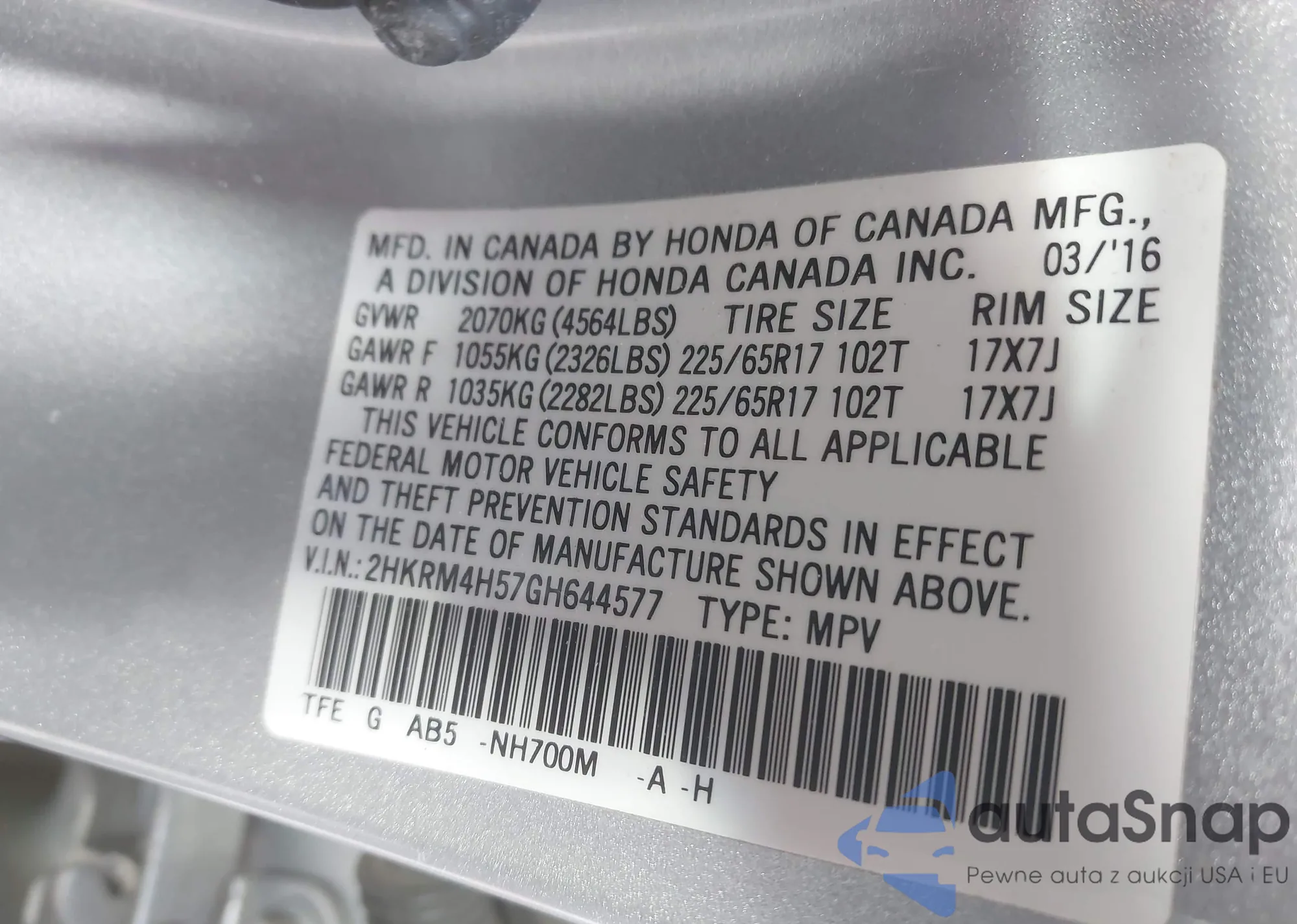 • VIN 2HKRM4H57GH644577