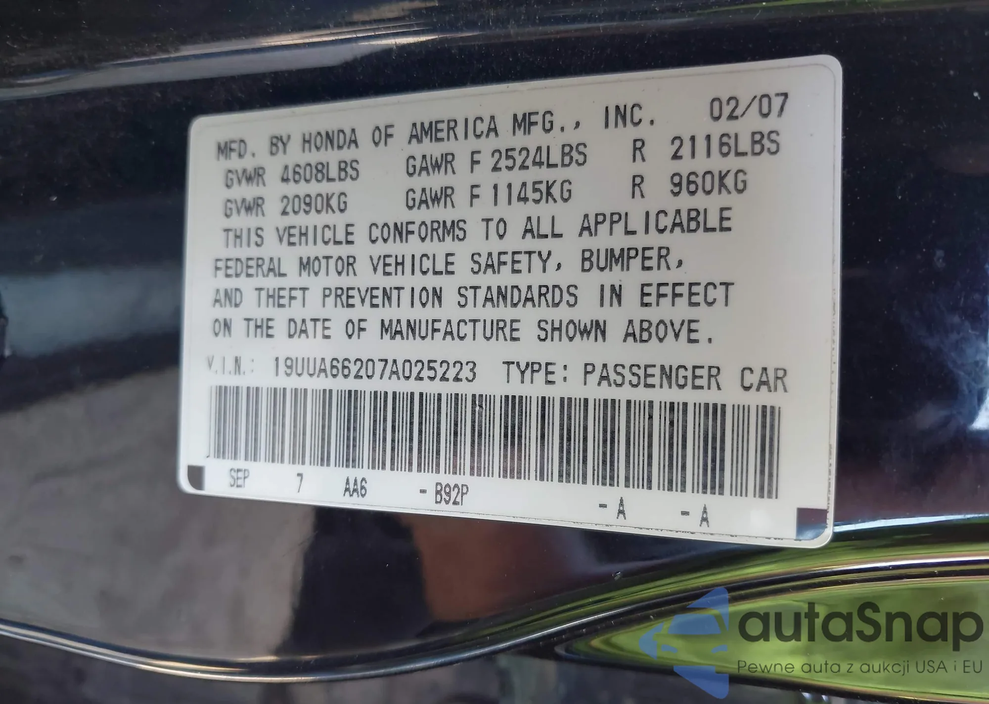 • VIN 19UUA66207A025223