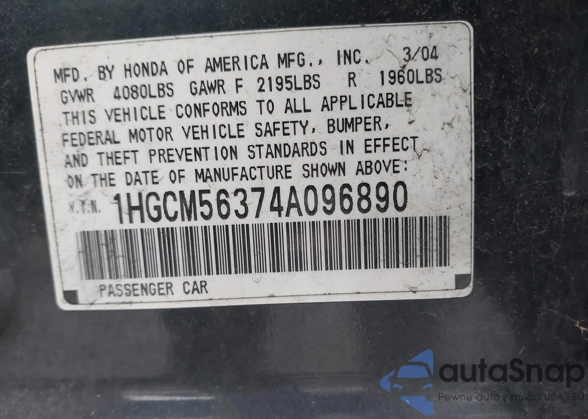 LOT: 43183440 VIN: 2HKYF18124H507625