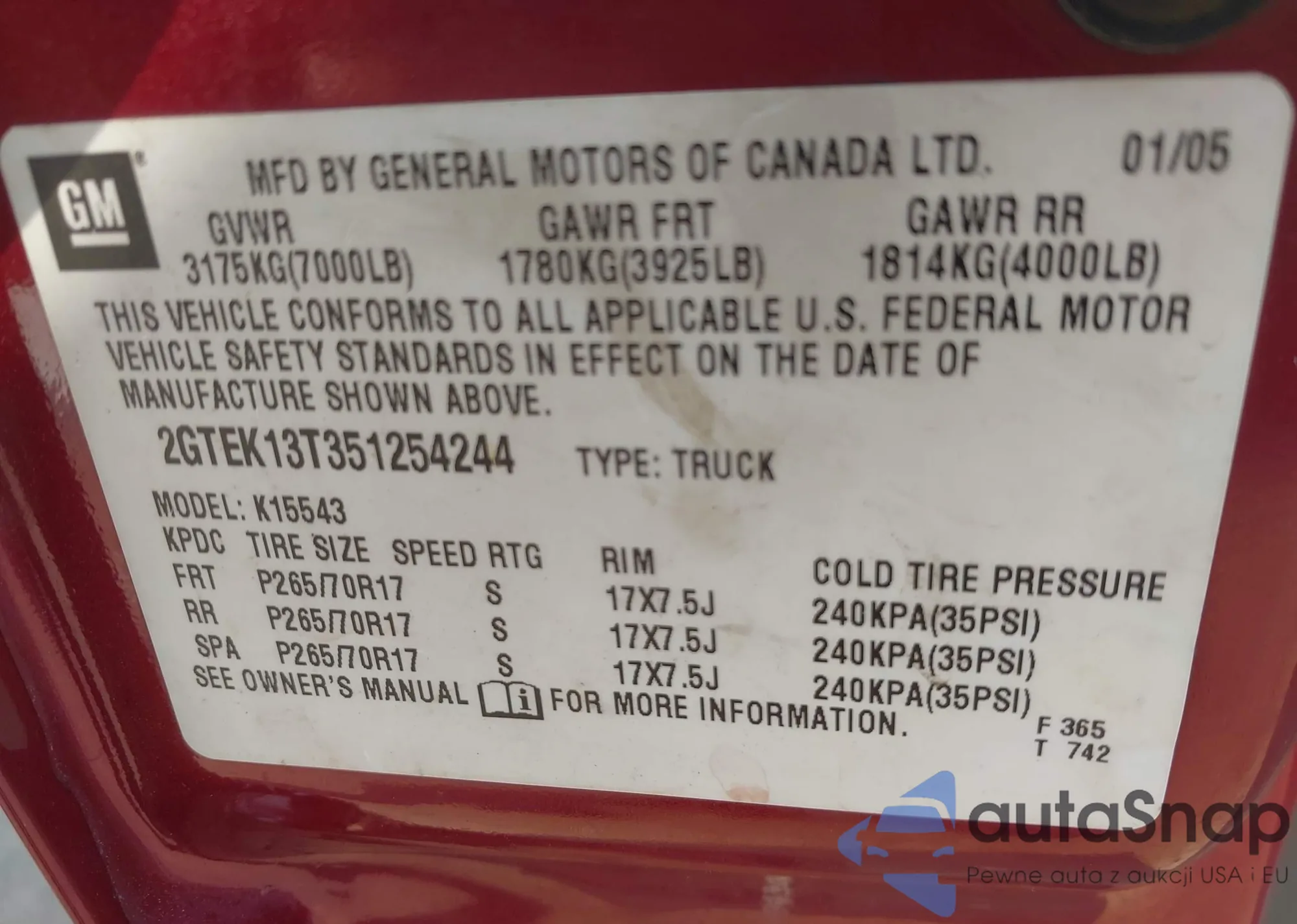 • VIN 2GTEK13T351254244