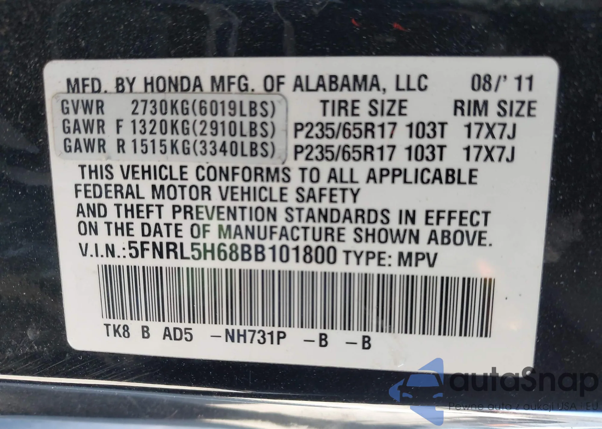 • VIN WAUG8AFCXHN030813