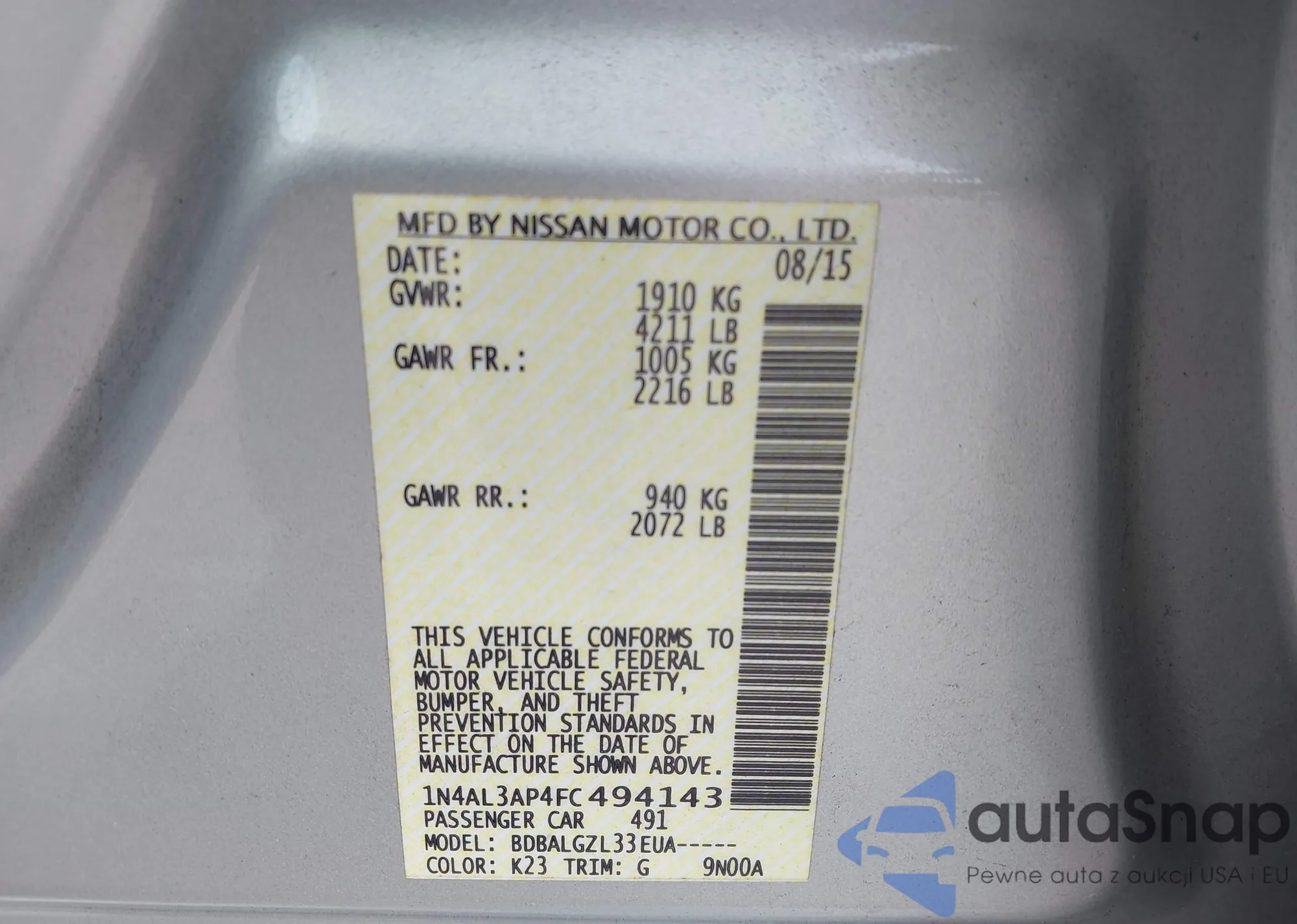 LOT: 43753487 VIN: 1N4AL3AP4FC494143