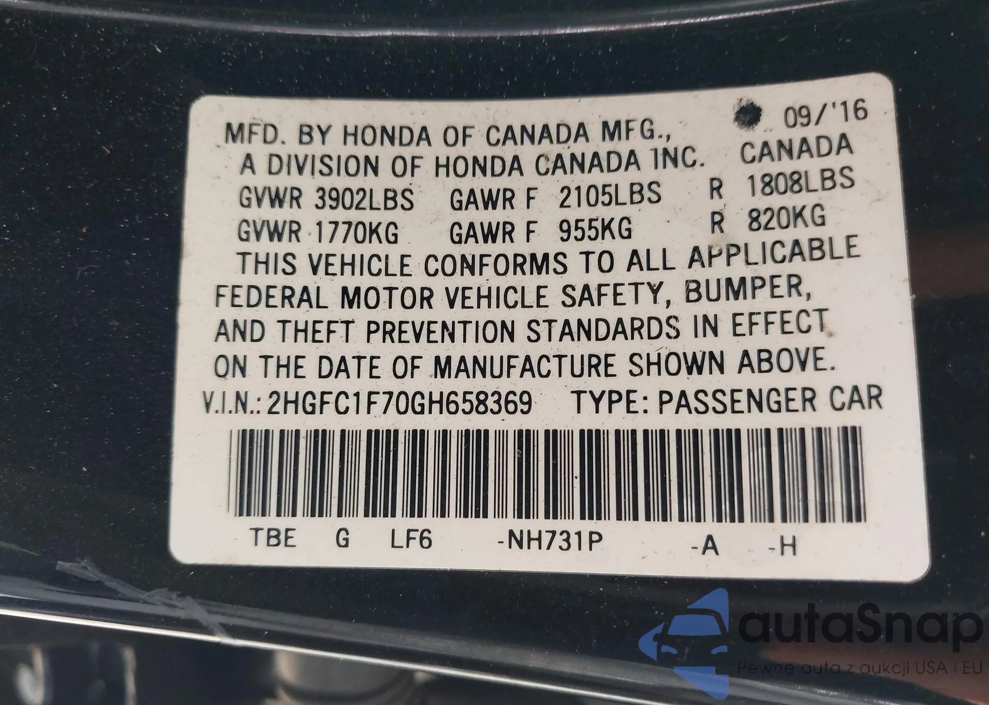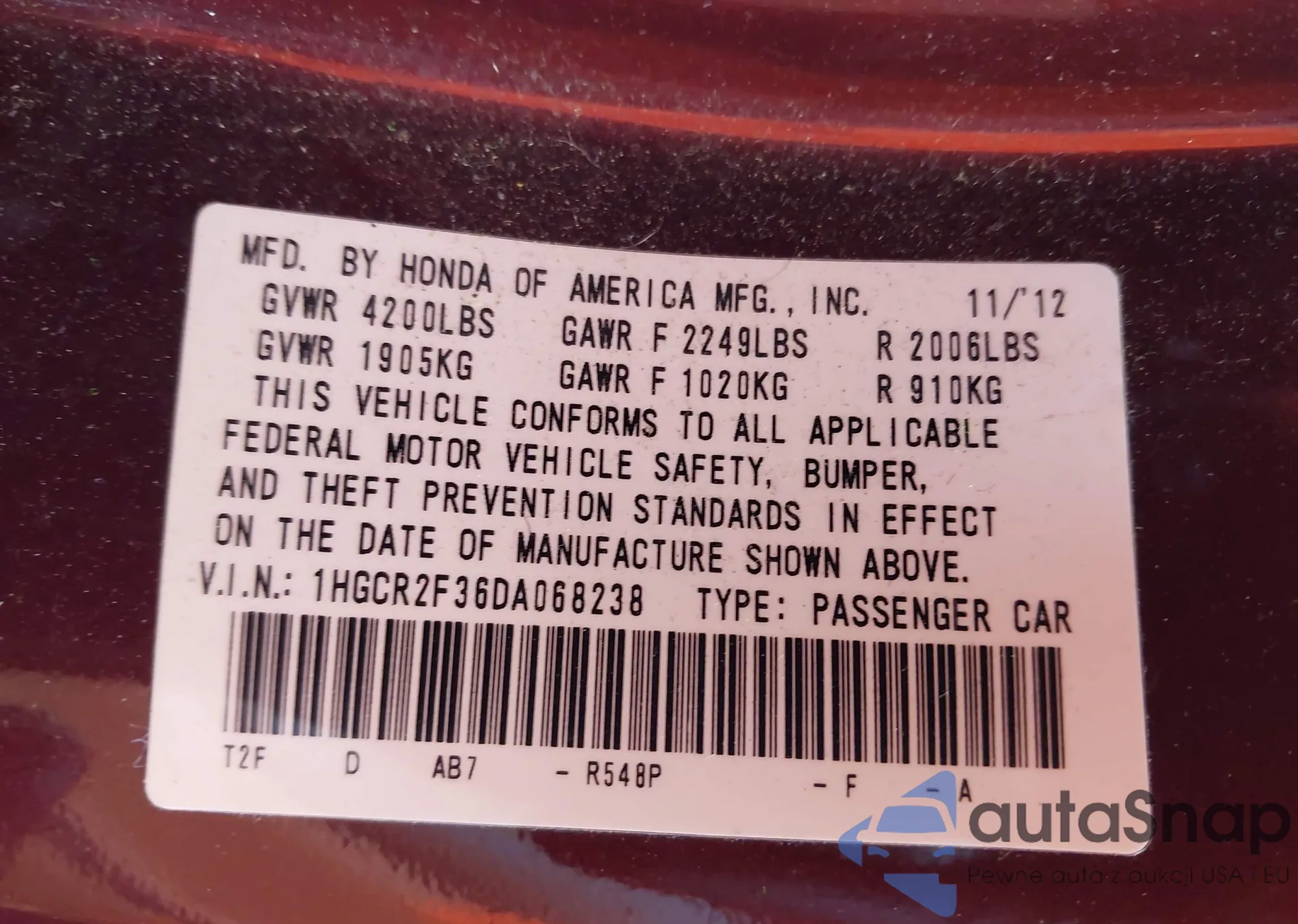 LOT: 43653304 VIN: 1HGCR2F36DA068238