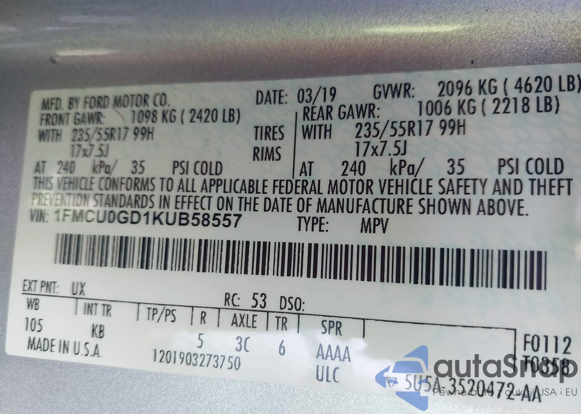 LOT: 43332293 VIN: 1FMCU0GD1KUB58557