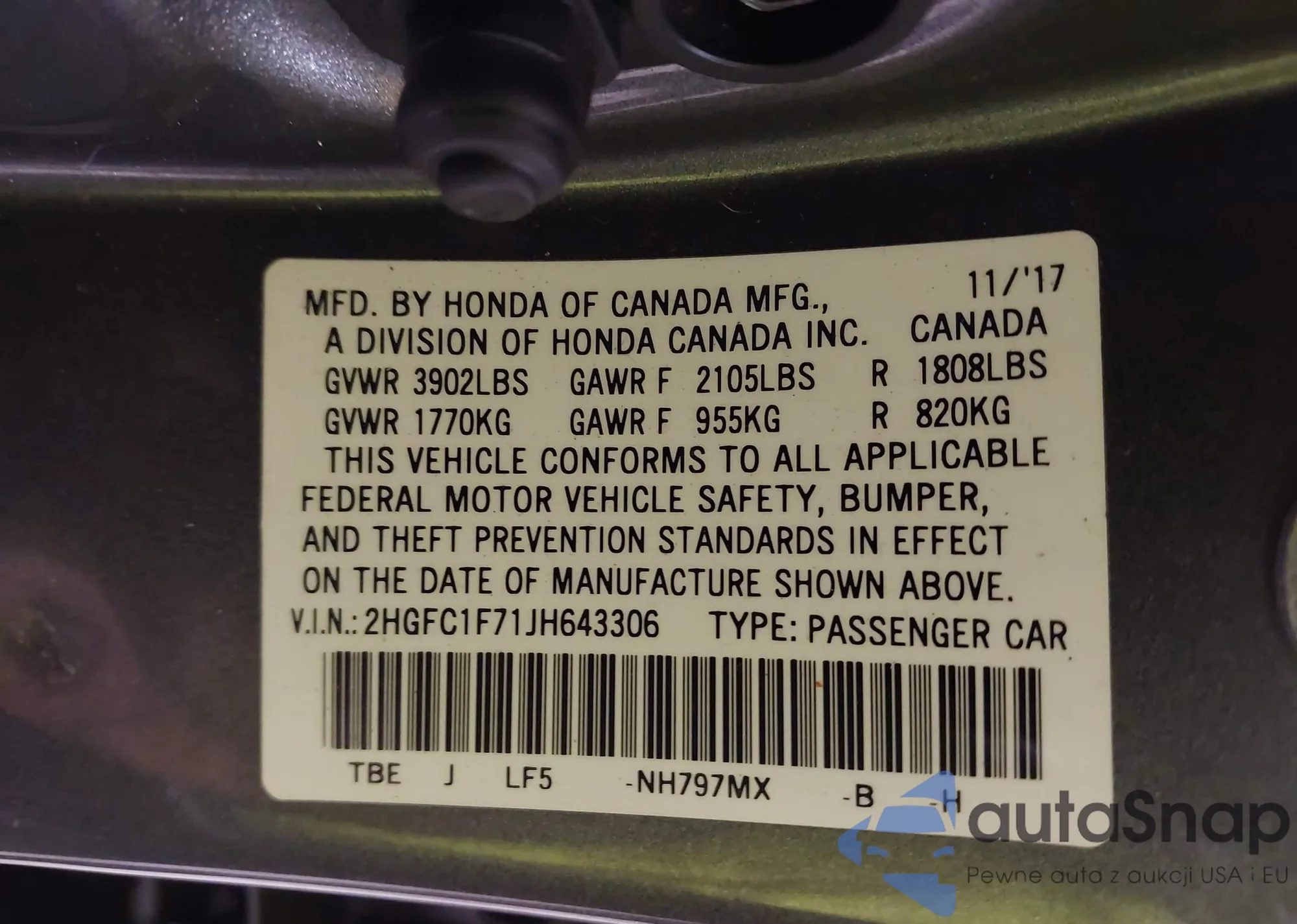 • VIN 2HGFC1F71JH643306