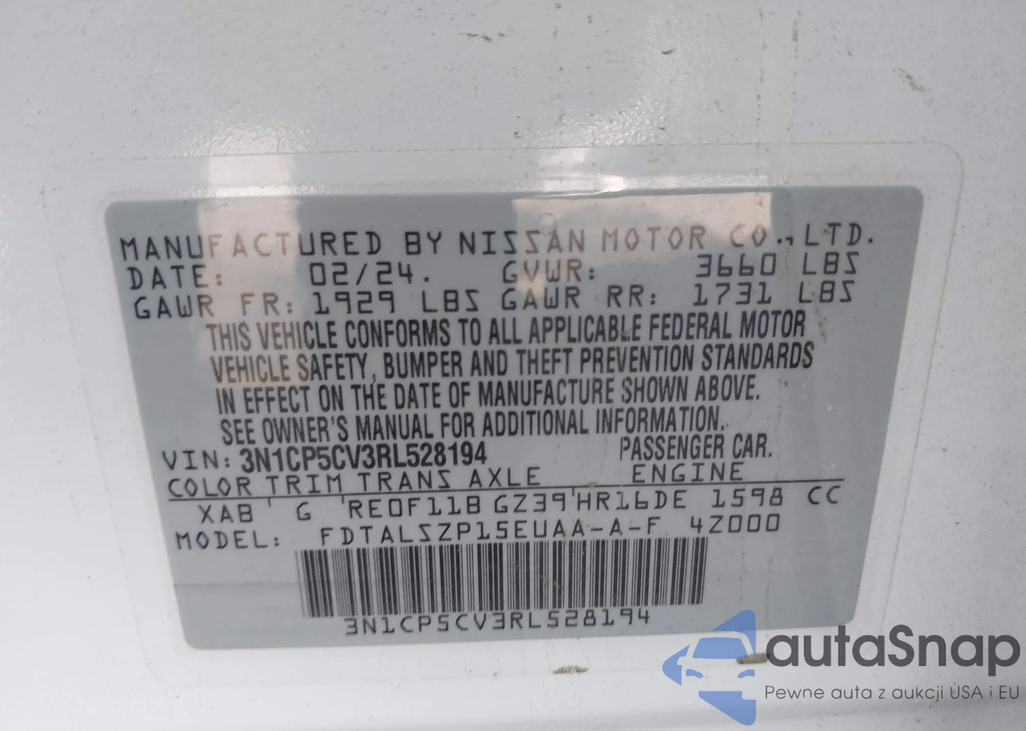 LOT: 43478189 VIN: 1N4BL4CV0KC104994