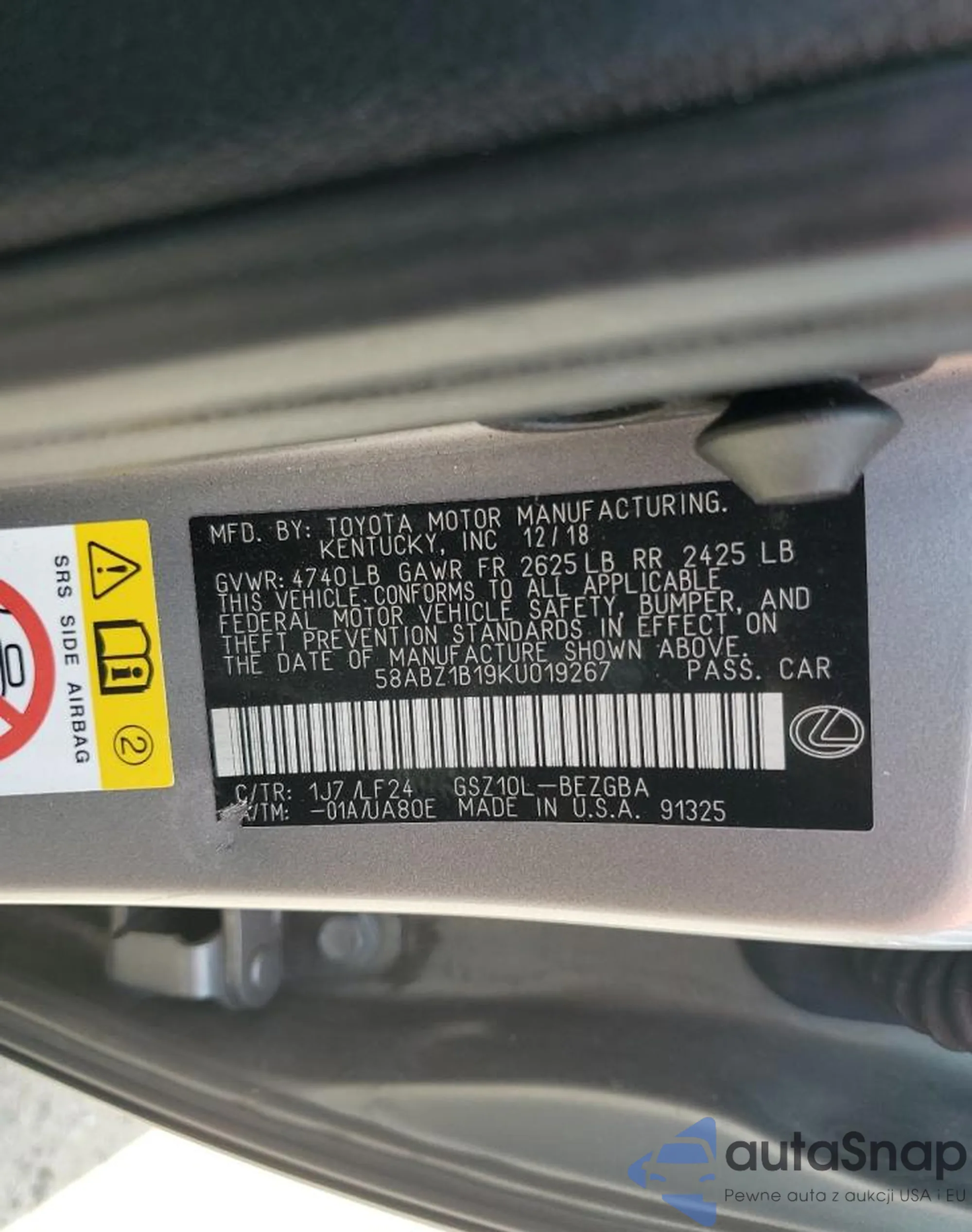 LOT: 69631925 VIN: 58ABZ1B19KU019267