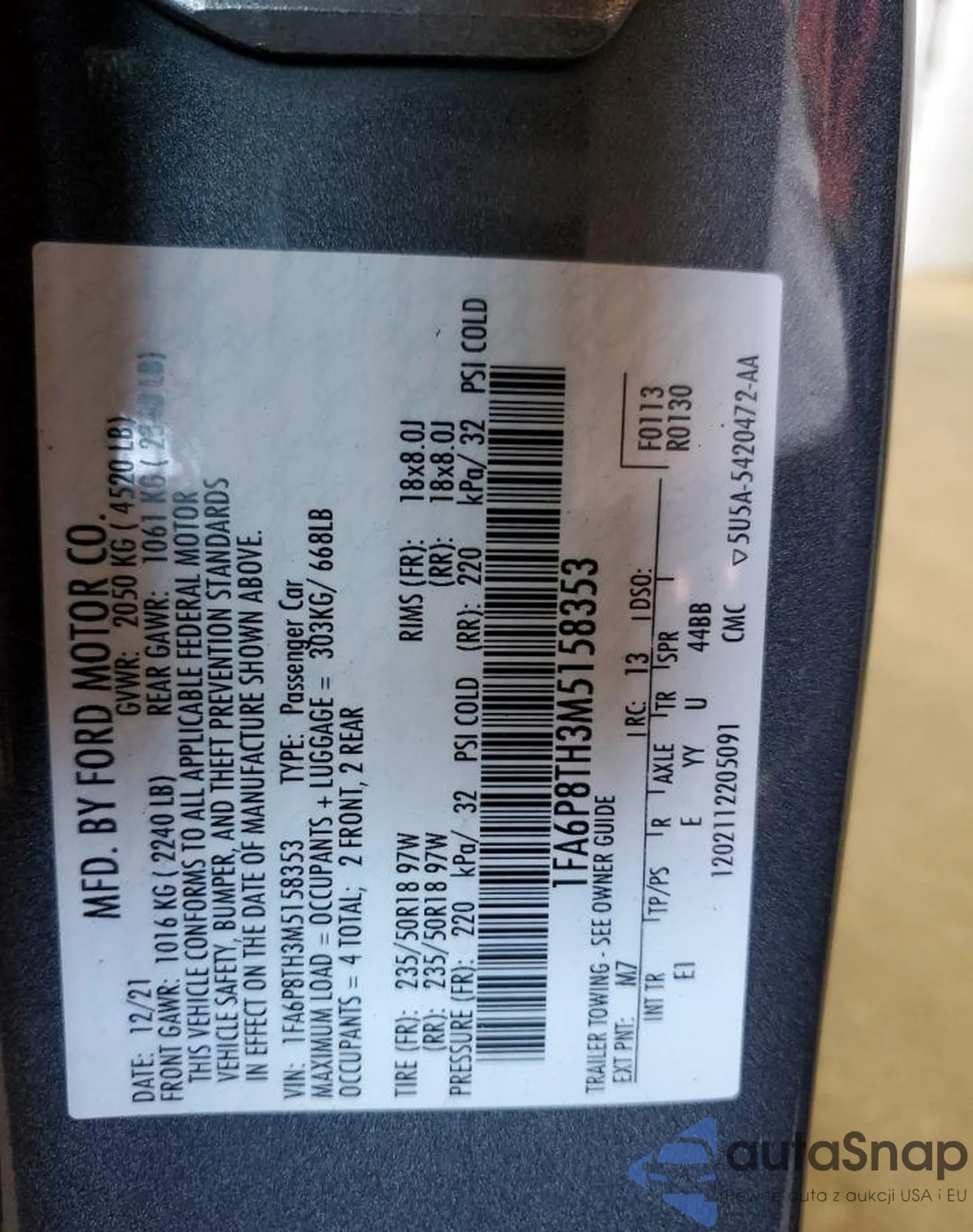 LOT: 71054955 VIN: 1FA6P8TH3M5158353