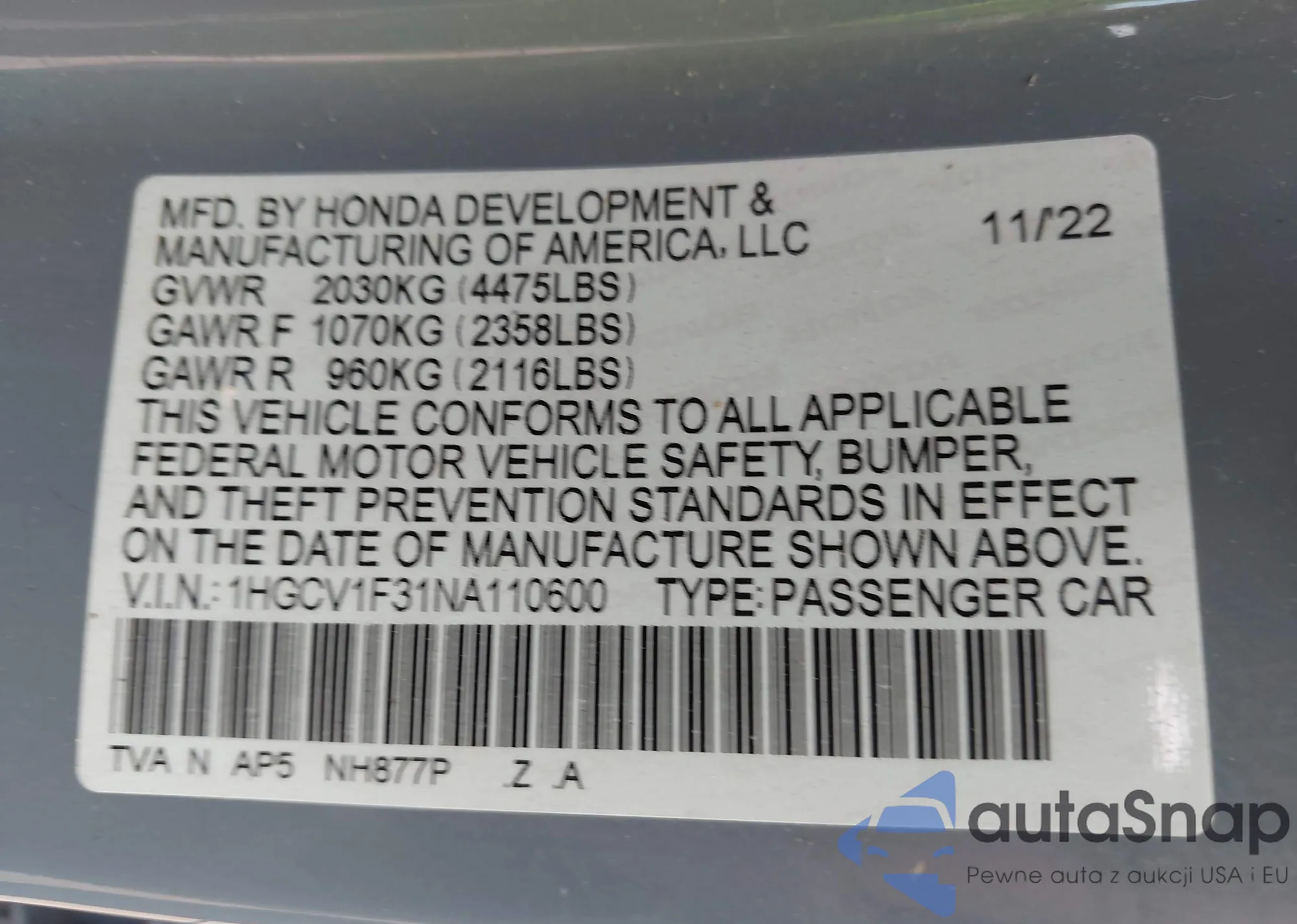 • VIN 1HGCV1F31NA110600