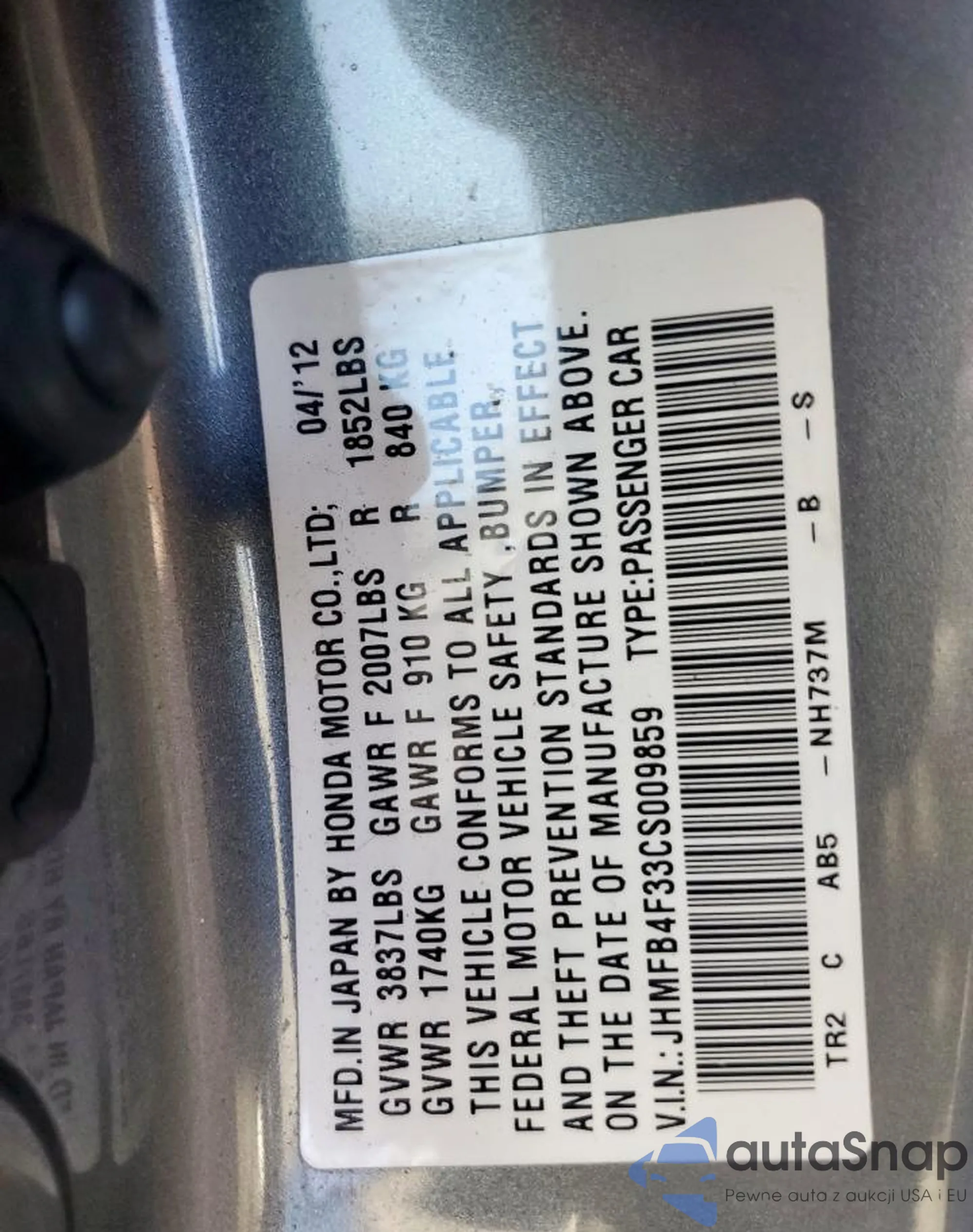 • VIN JHMFB4F33CS009859