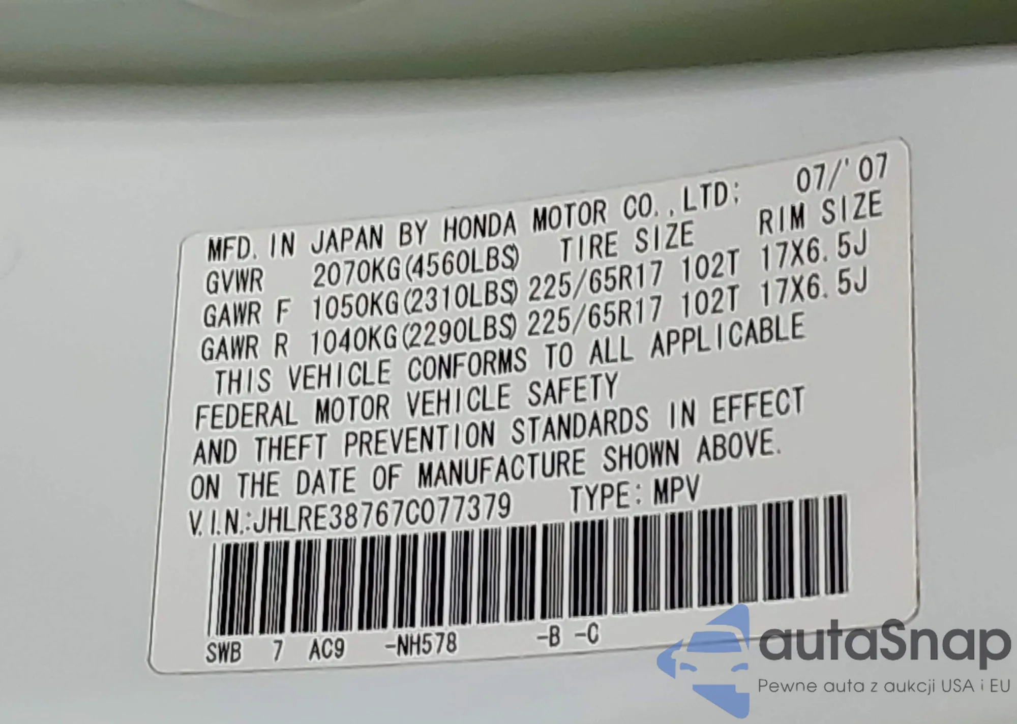 • VIN JHLRE38767C077379