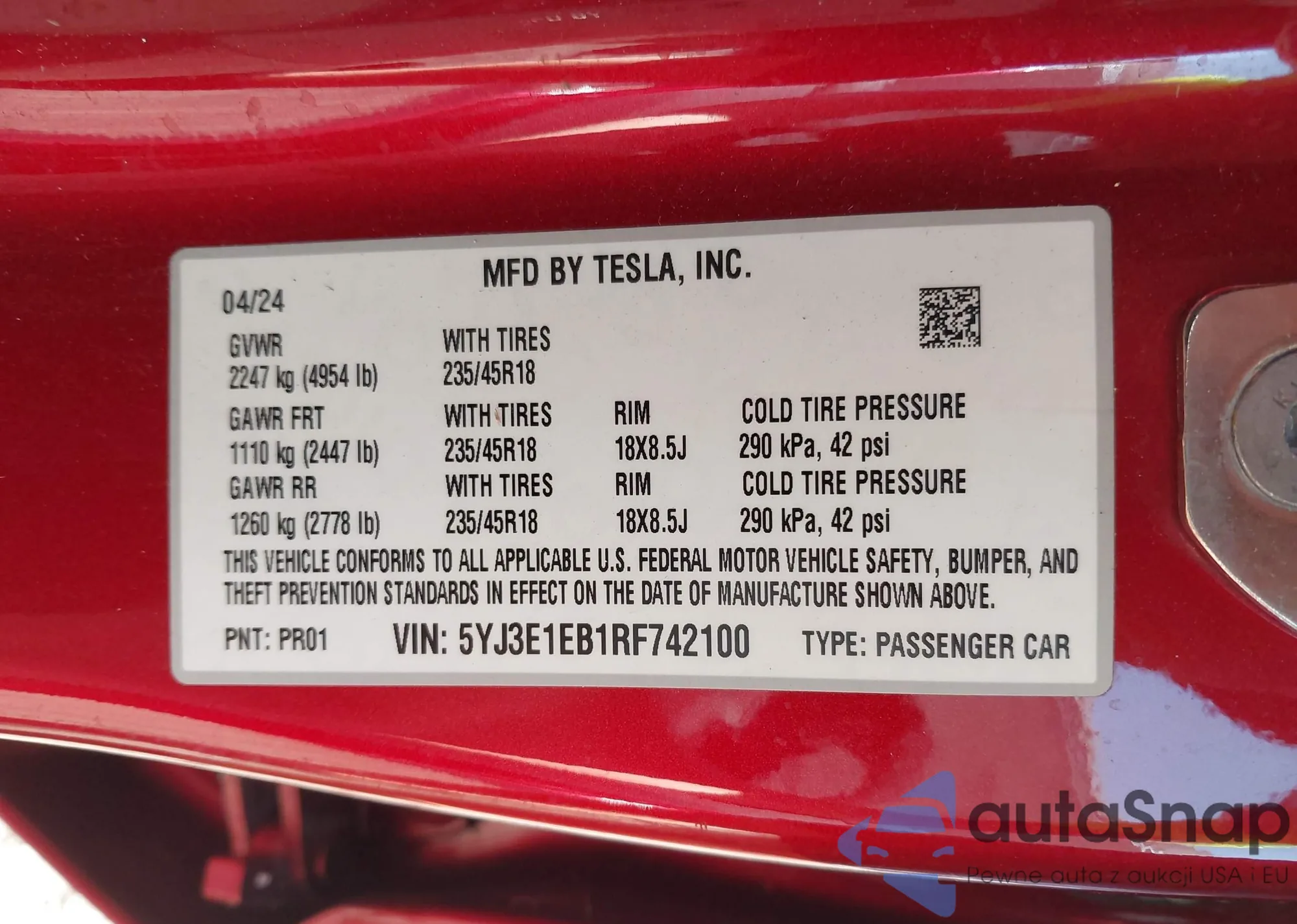 • VIN 5YJ3E1EB1RF742100