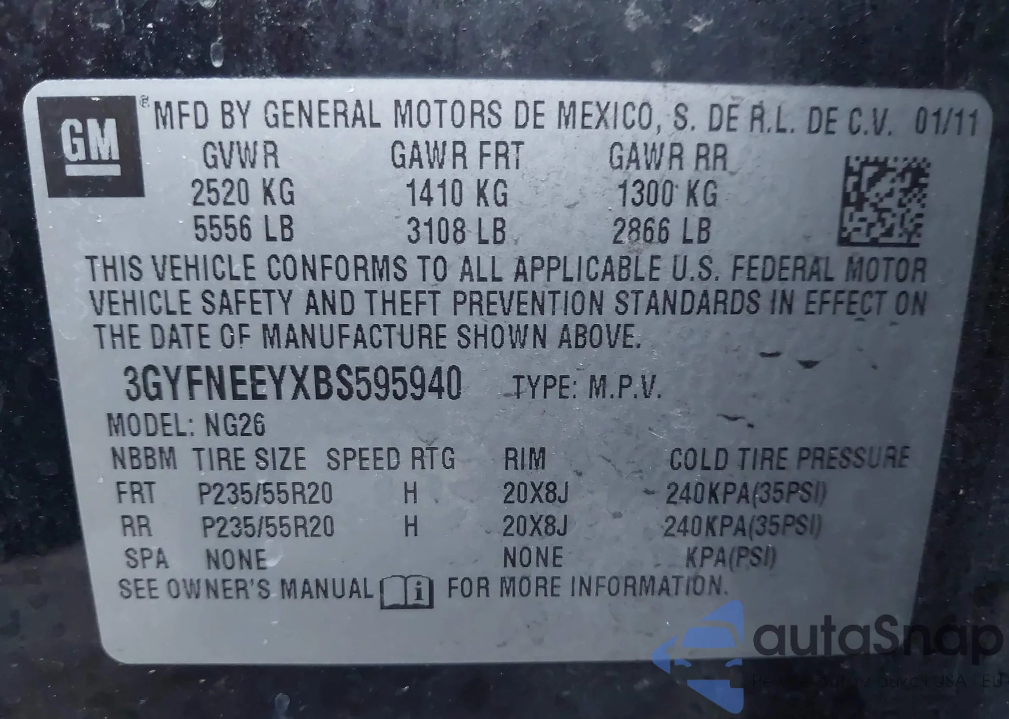 • VIN 3GYFNEEYXBS595940