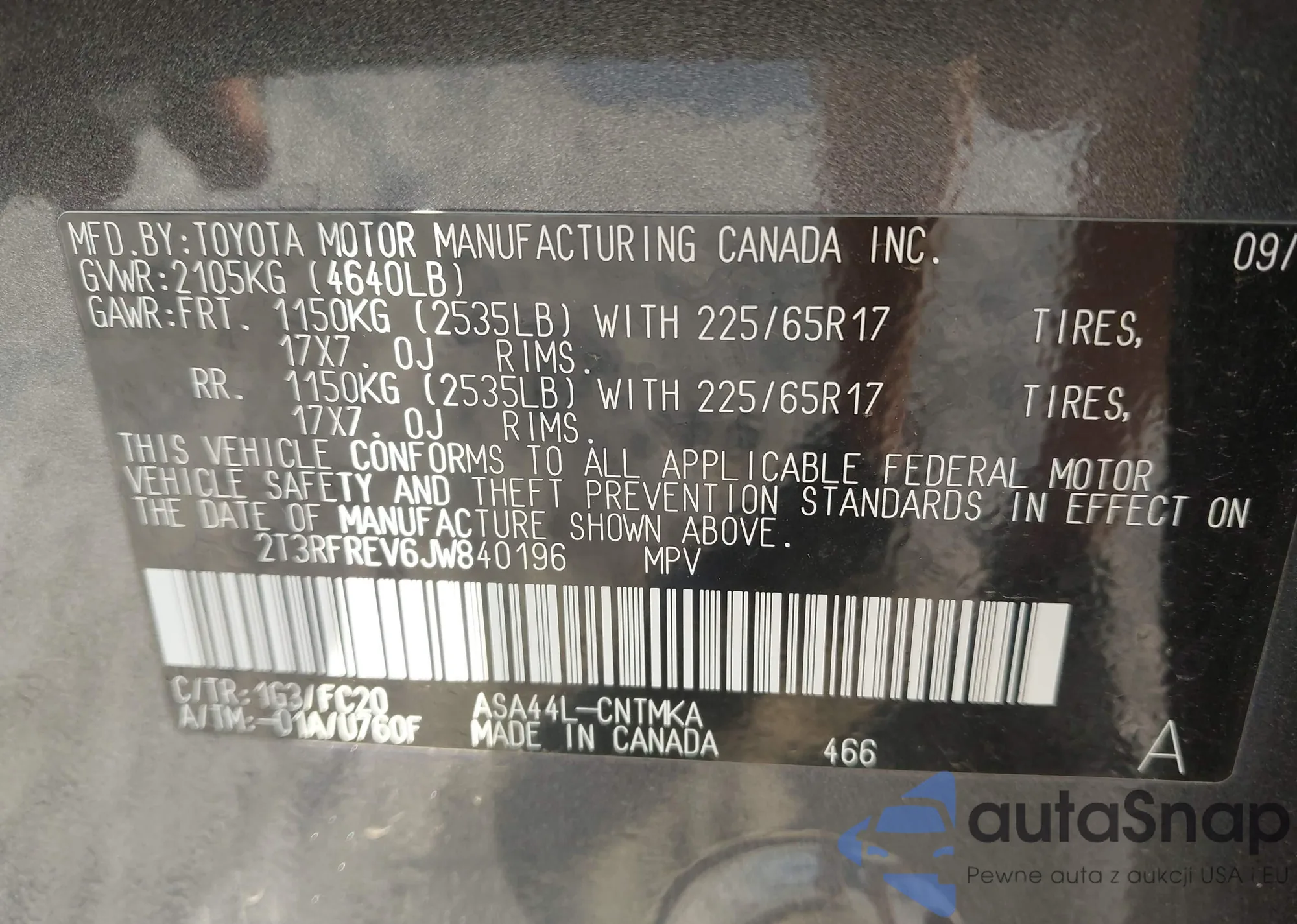 LOT: 43591271 VIN: JTMRFREV6JJ738265