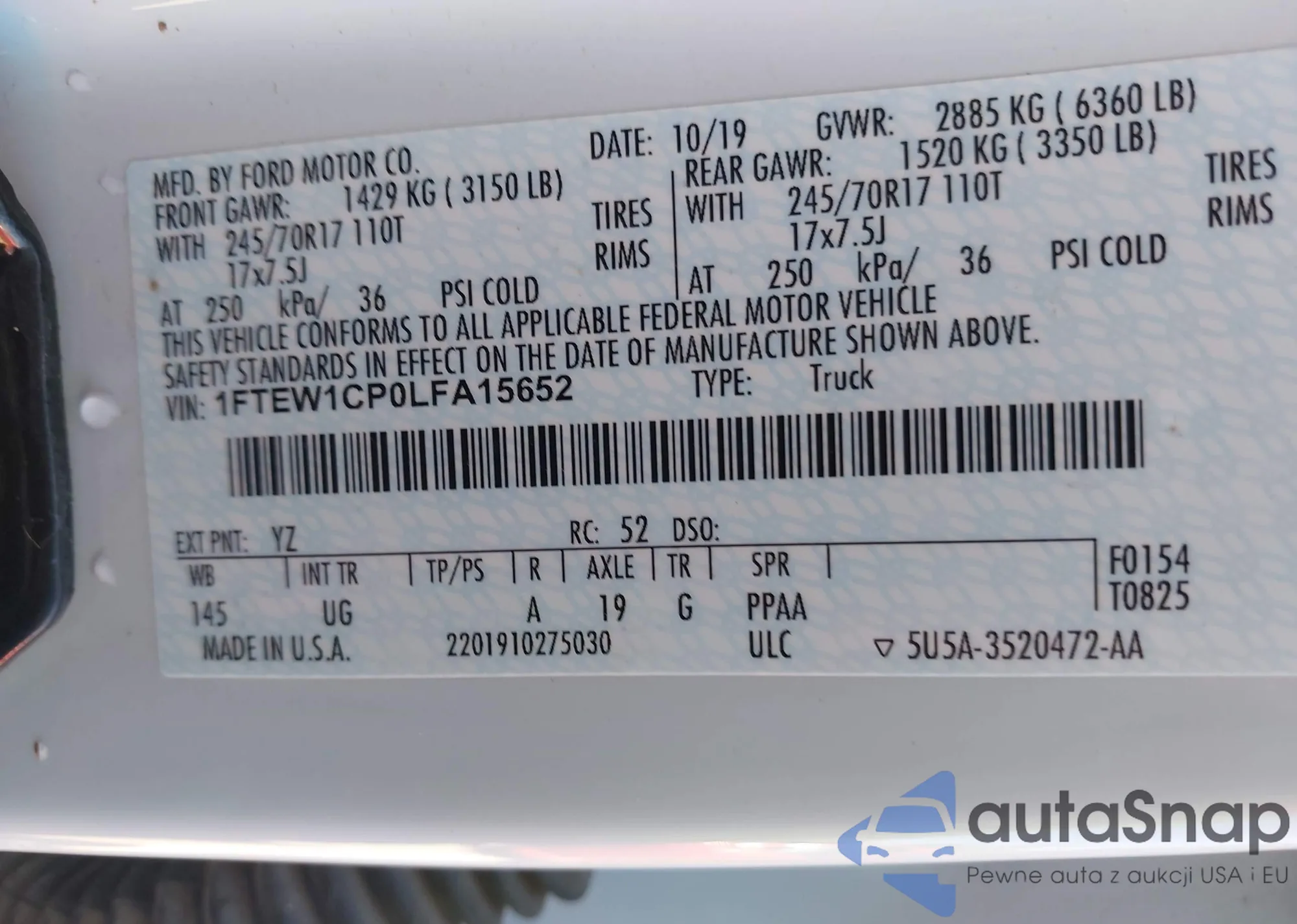 LOT: 43333114 VIN: 1FTEW1CP0LFA15652