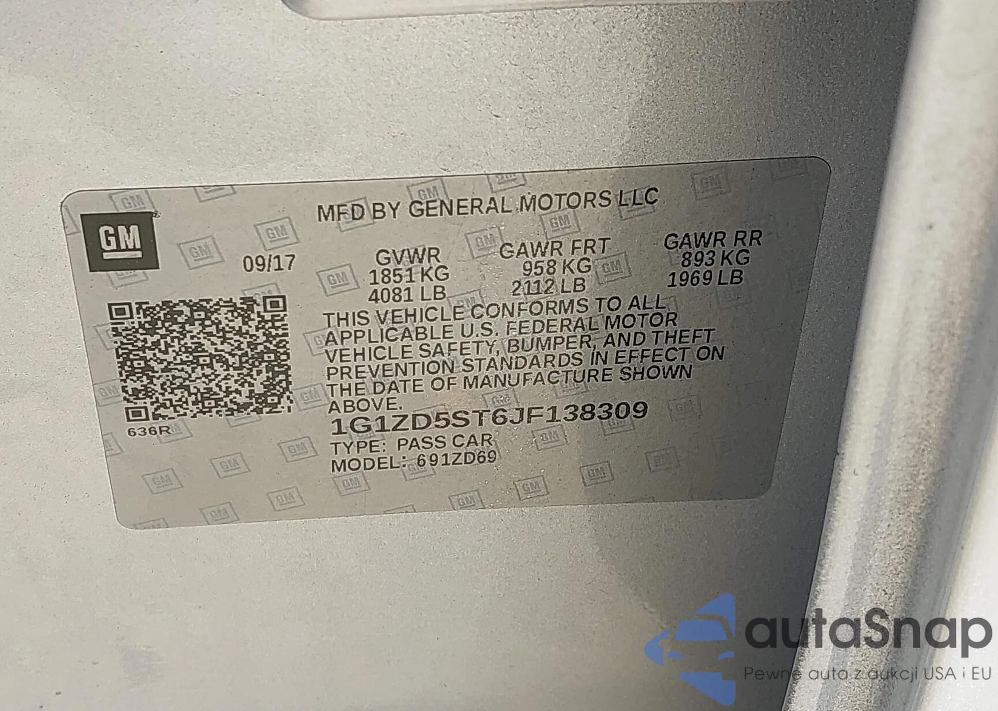 • VIN 1G1ZD5ST6JF138309