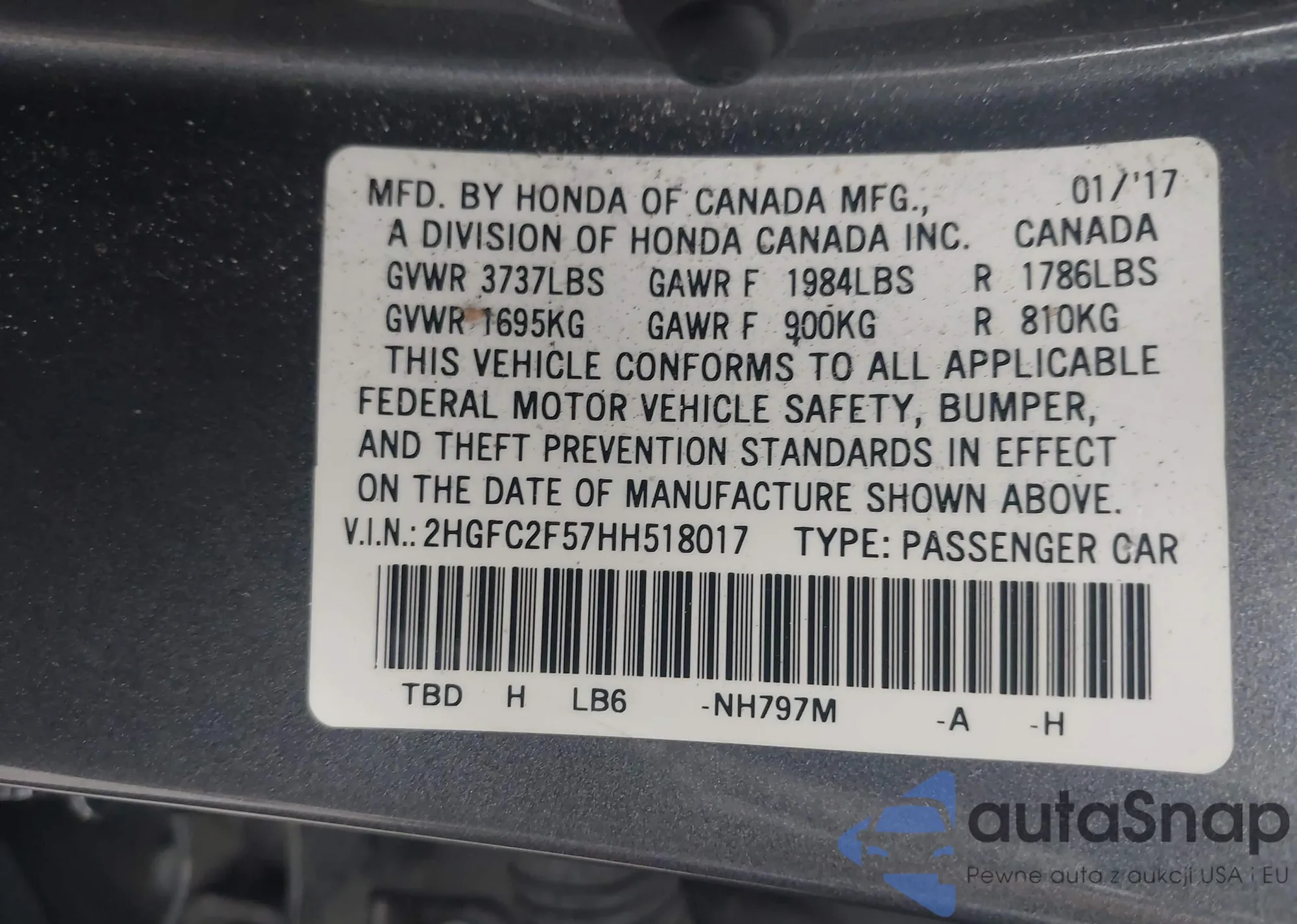 • VIN 2HGFC2F57HH518017