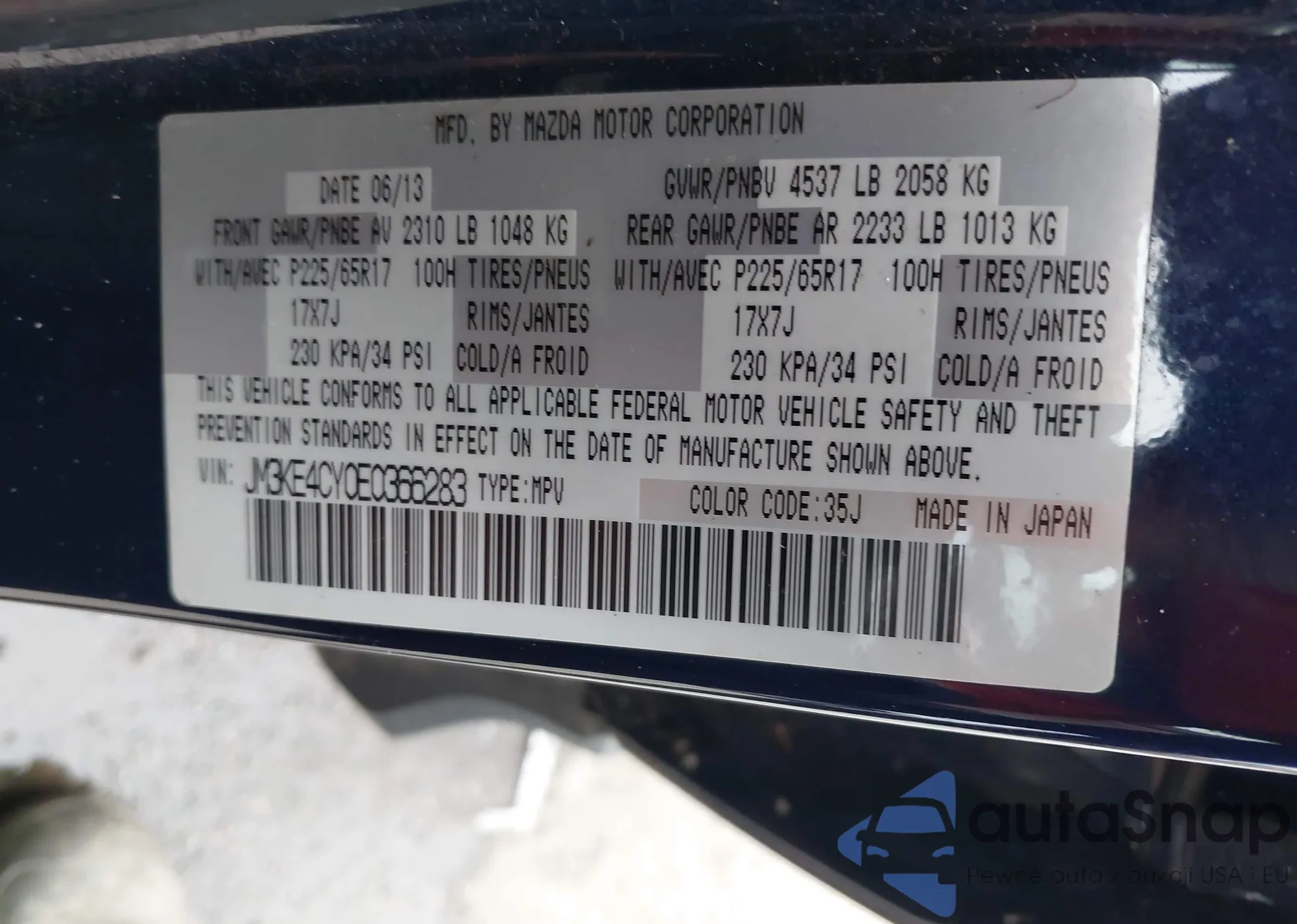 LOT: 43761535 VIN: JM3KE4CY0E0366283
