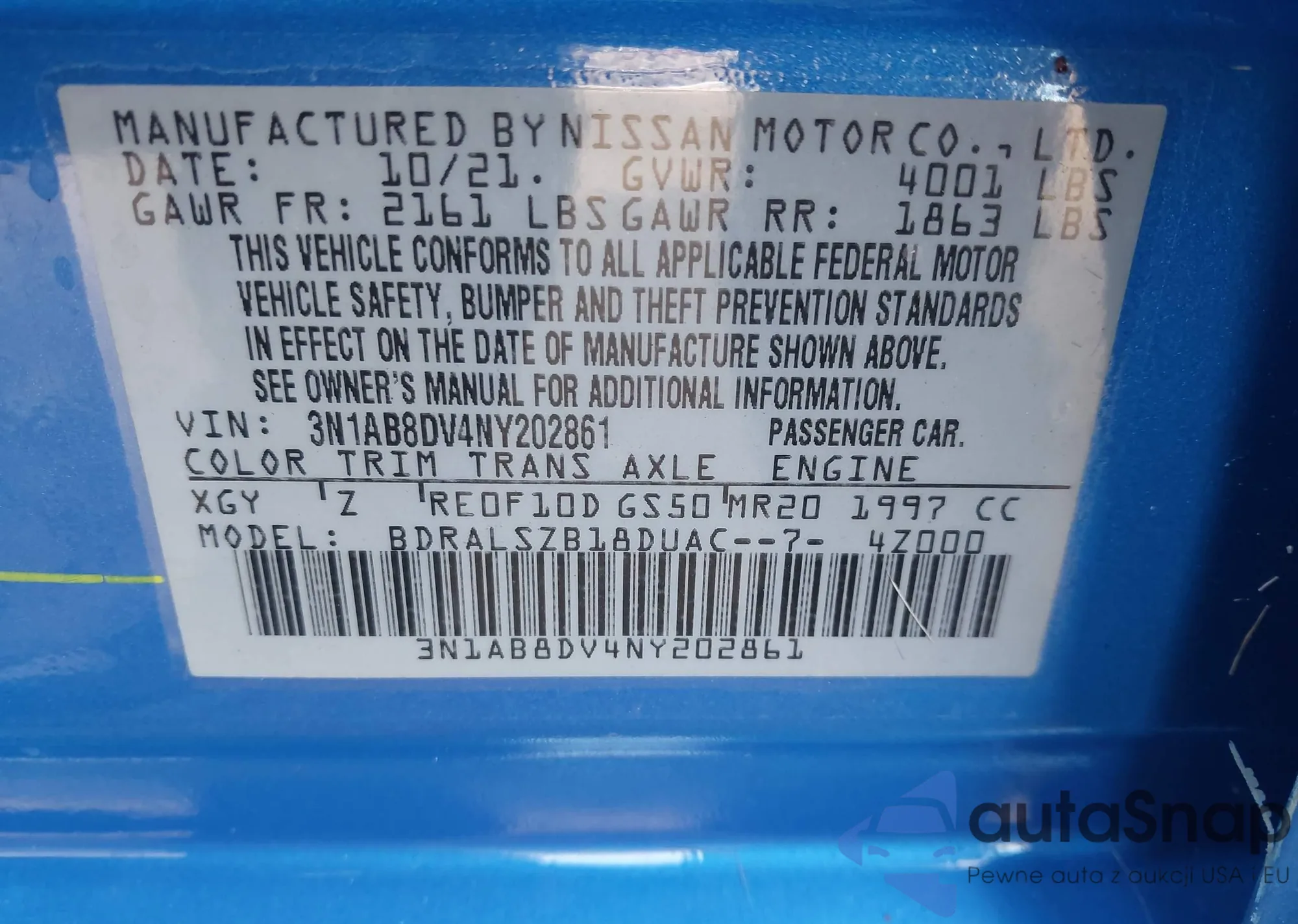 • VIN 3N1AB8DV4NY202861