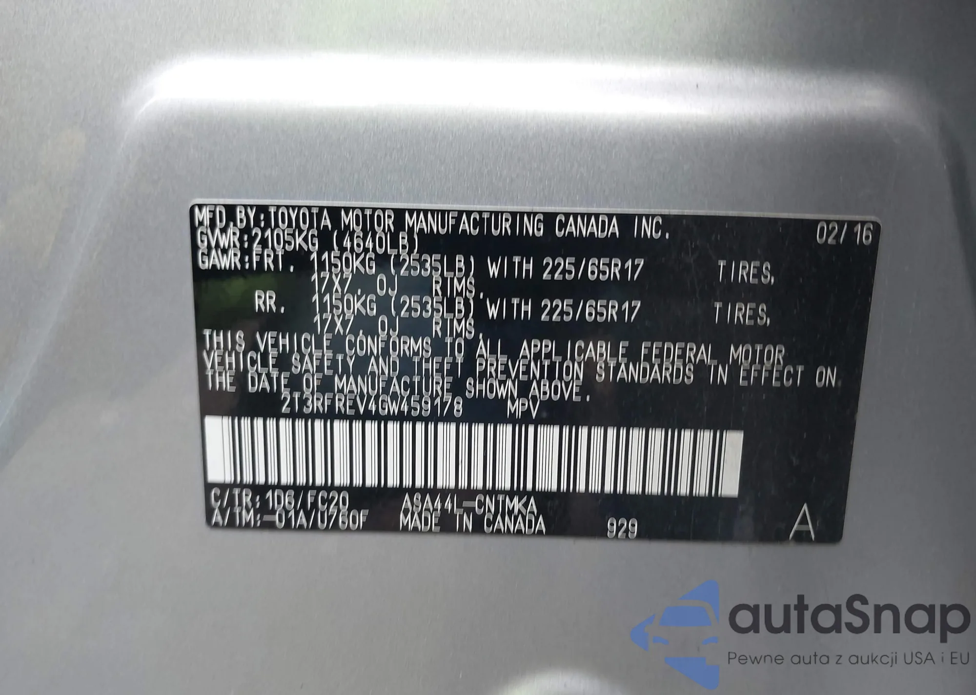 • VIN 2T3RFREV4GW459178