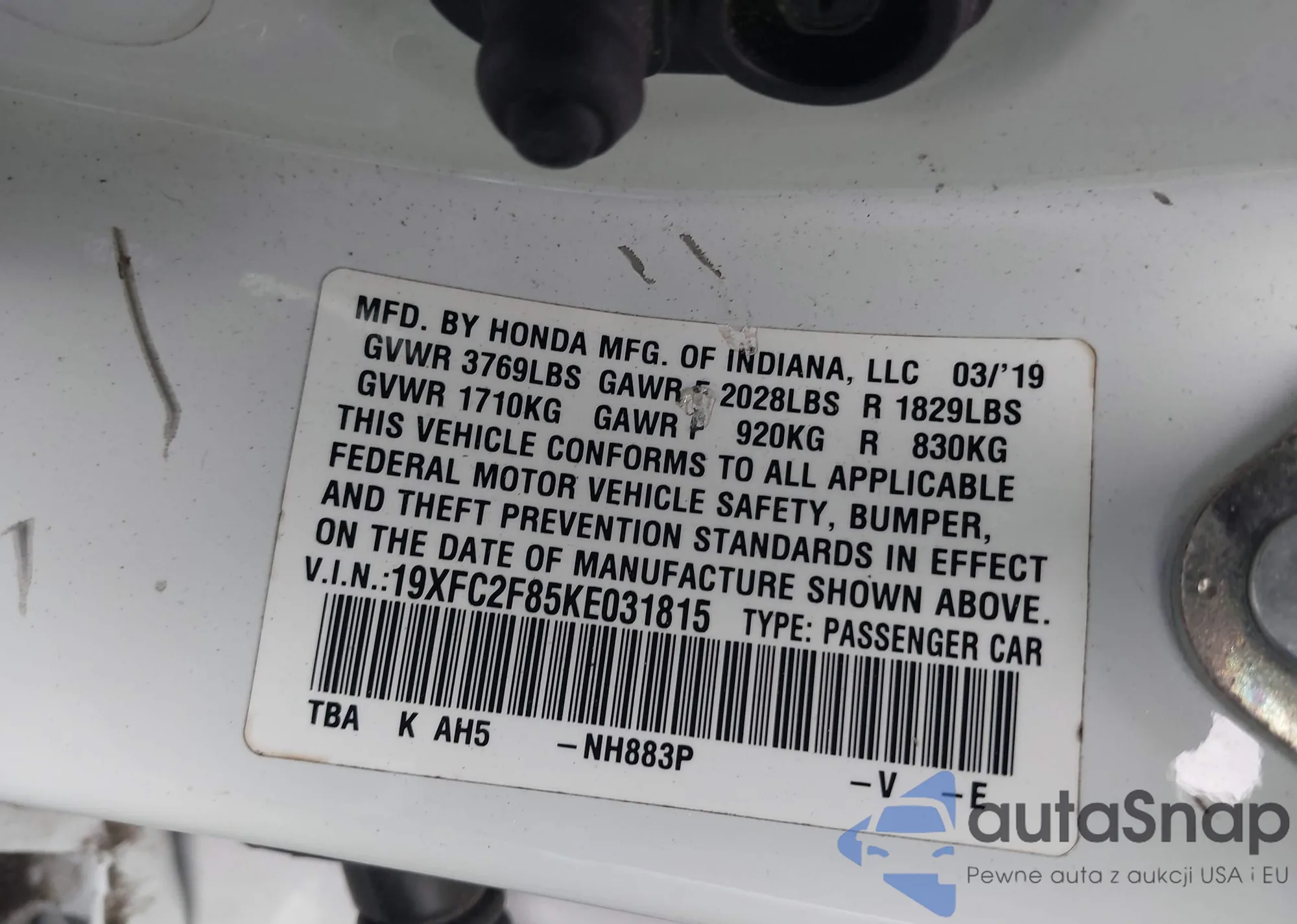 • VIN 19XFC2F85KE031815