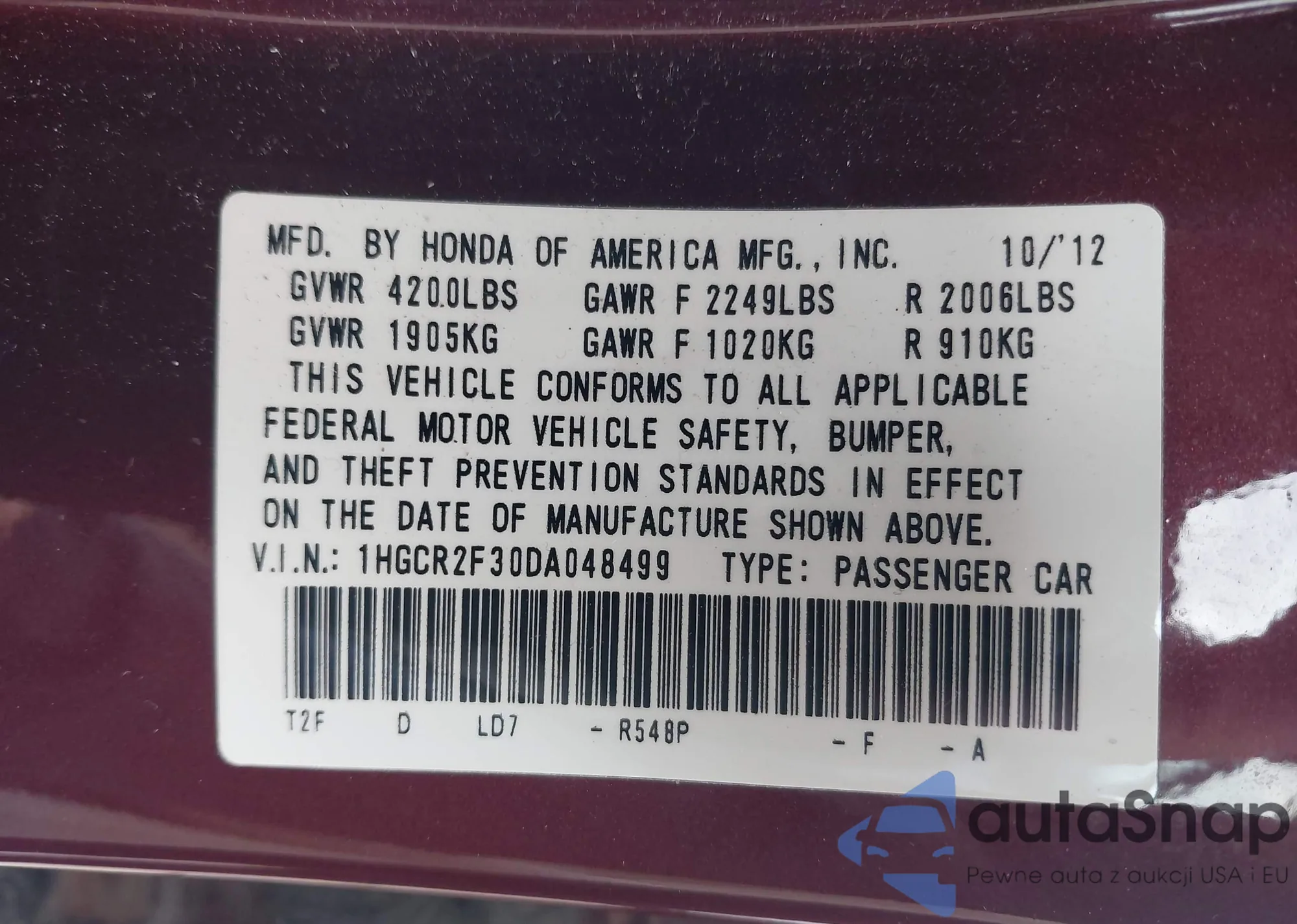LOT: 43225300 VIN: 1HGCP26458A079090
