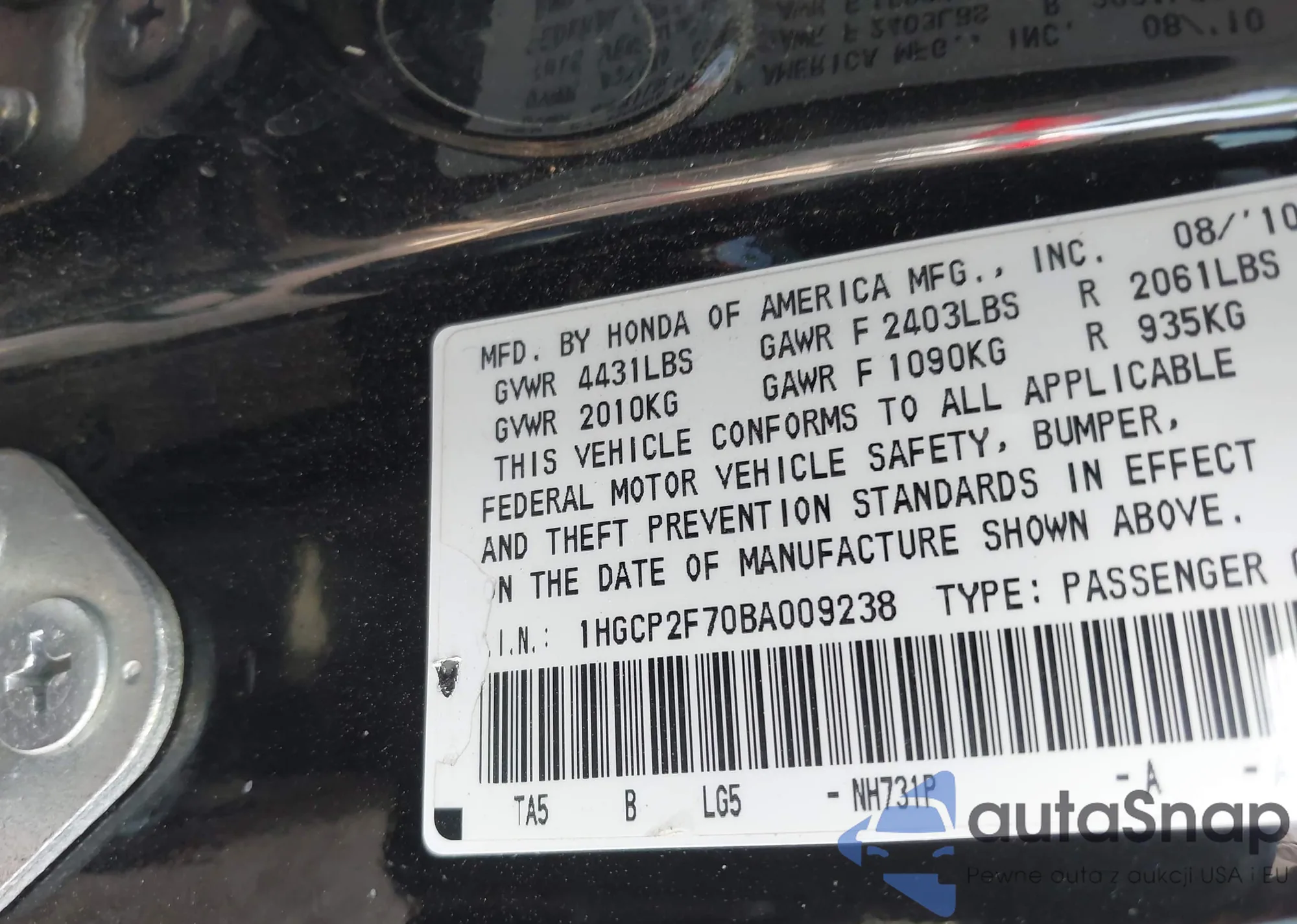 LOT: 42789649 VIN: 1HGCP2F70BA009238