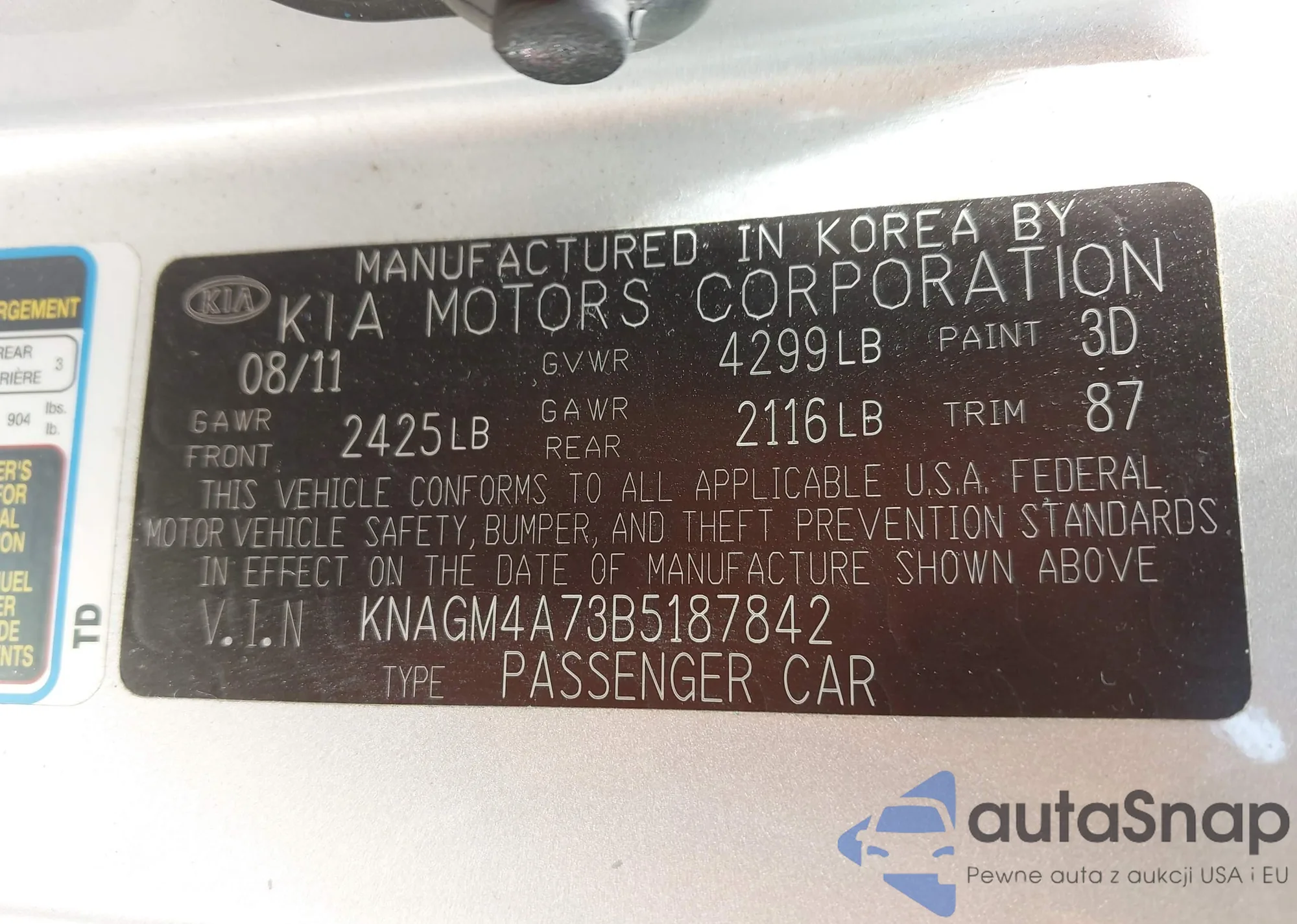 LOT: 40120665 VIN: KNAGM4A73B5187842