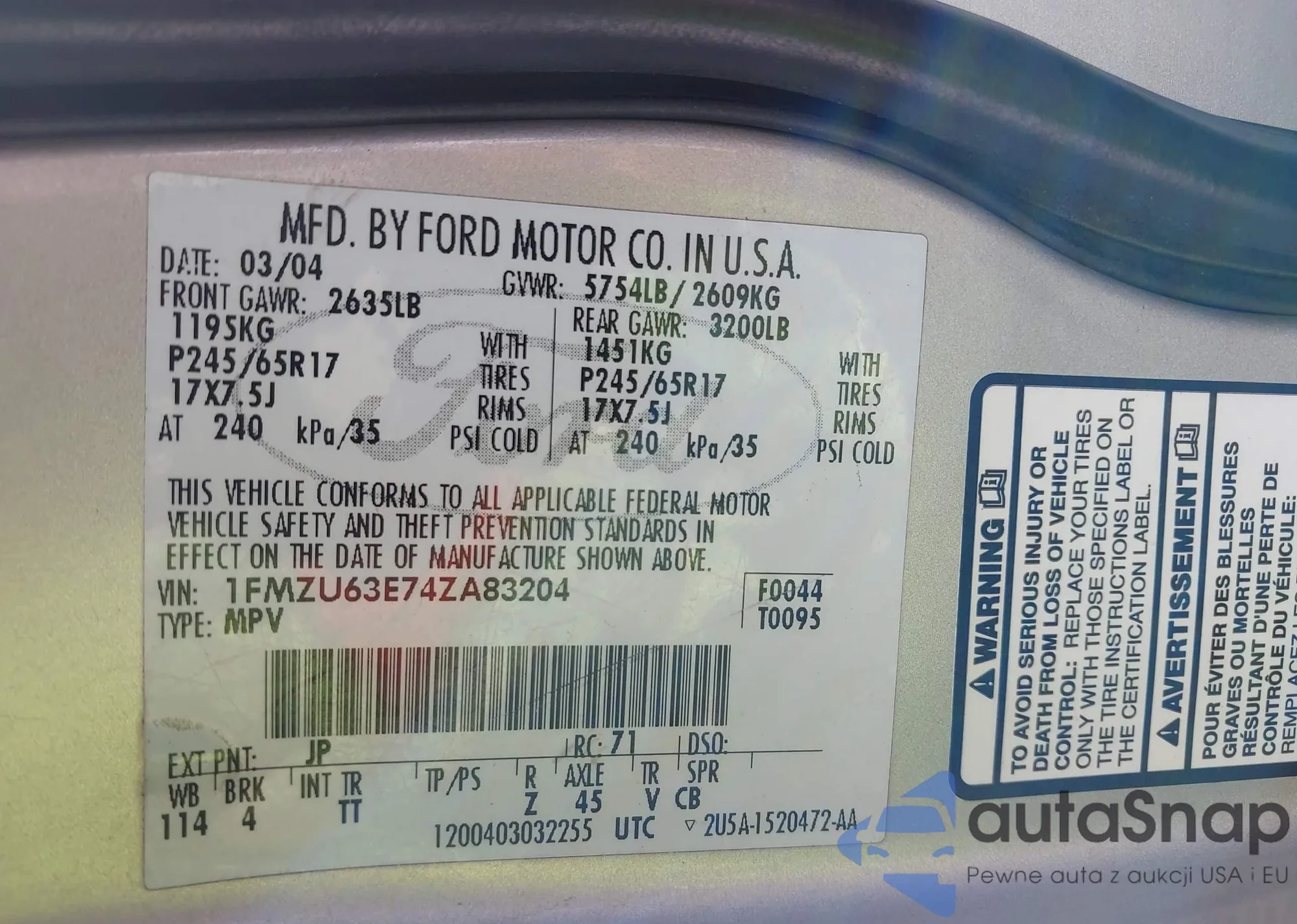 LOT: 43541941 VIN: 1FMZU63E74ZA83204