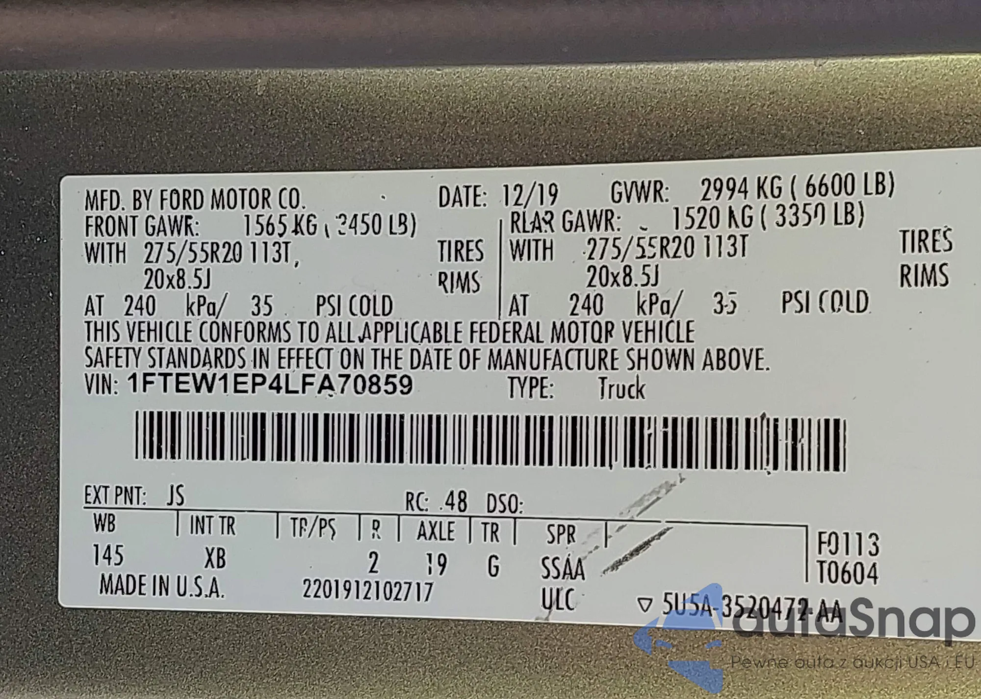 LOT: 42008404 VIN: 1FTEW1EP4LFA70859