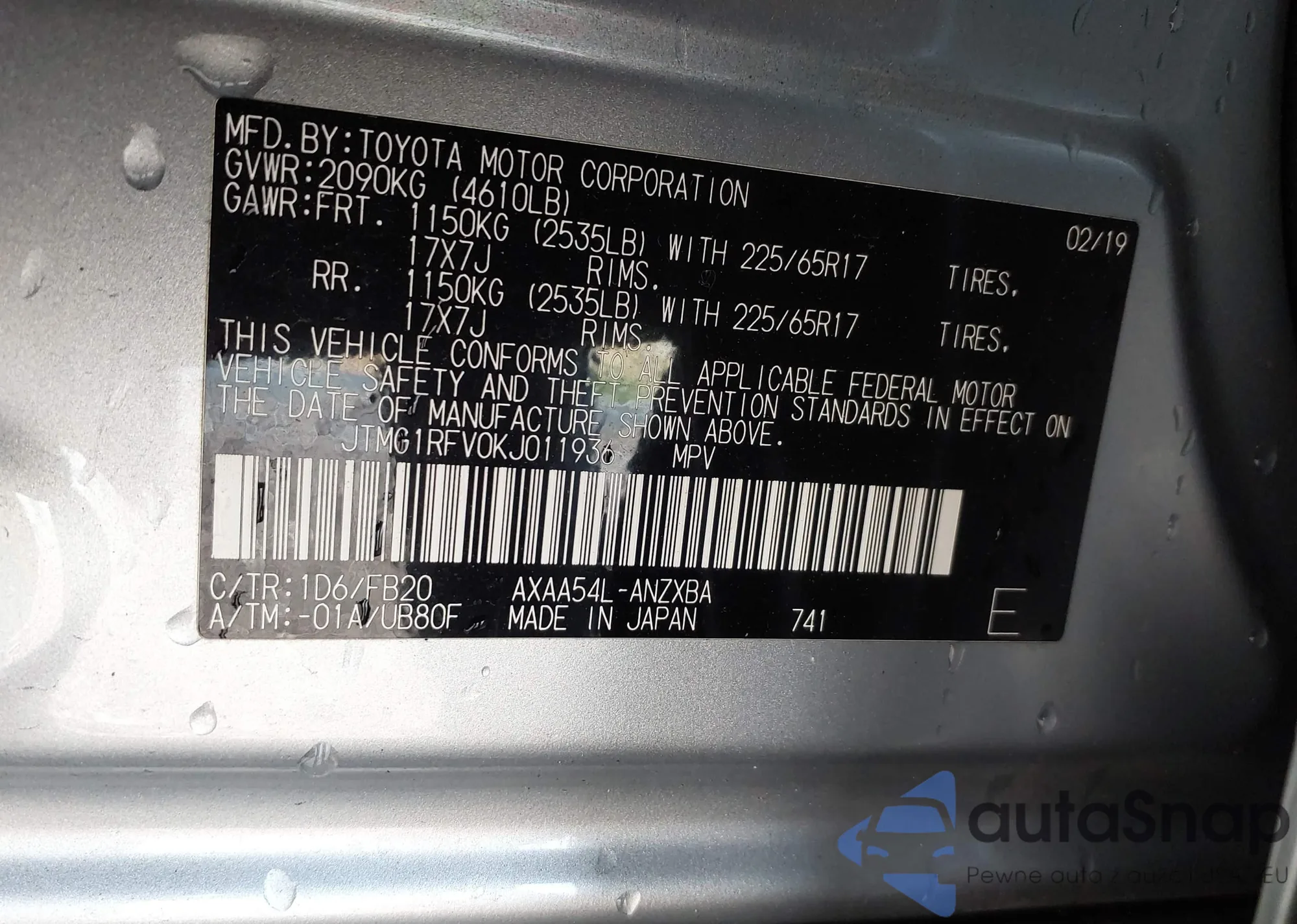 • VIN JTMG1RFV0KJ011936