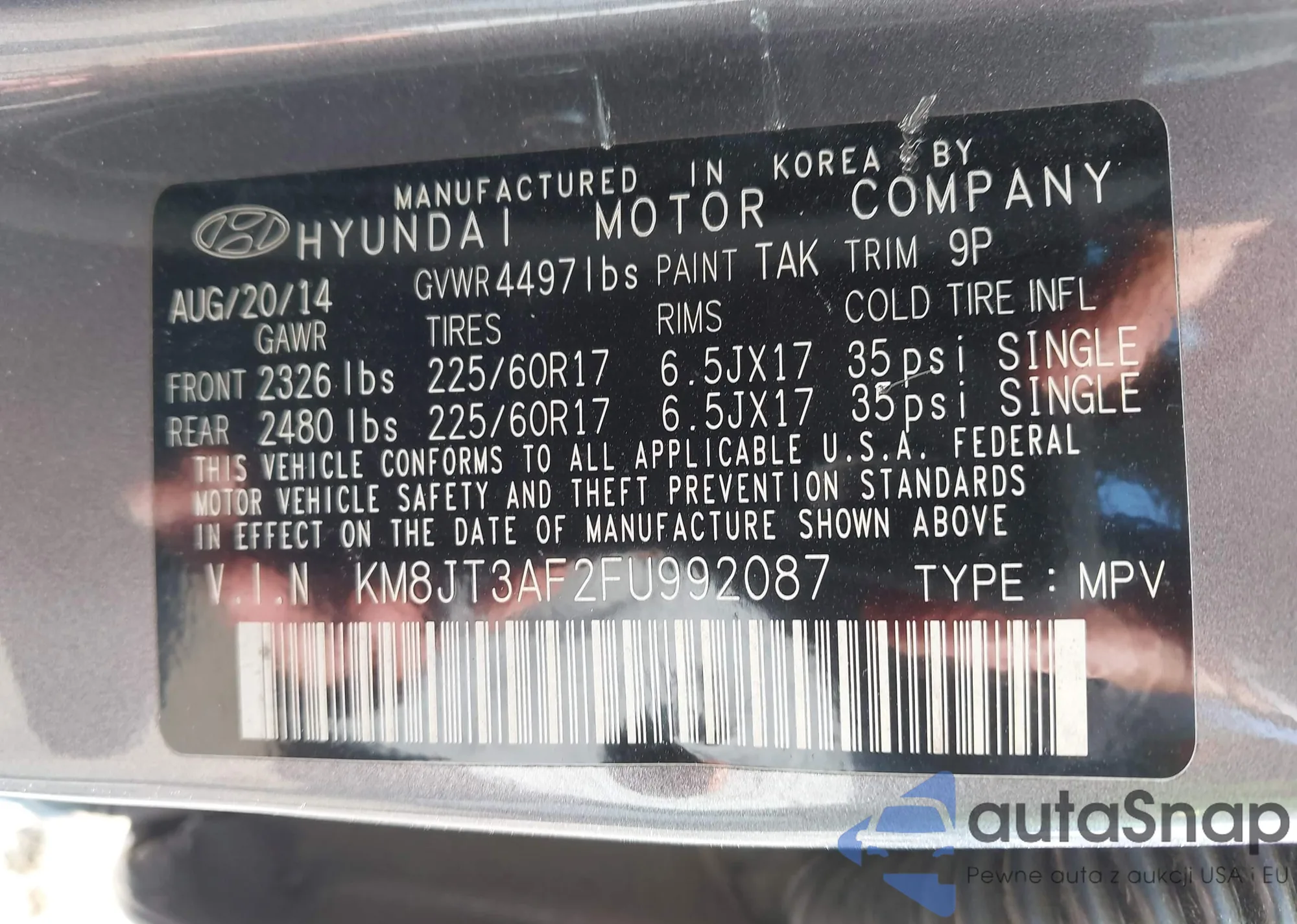 LOT: 43293399 VIN: KM8JT3AF2FU992087