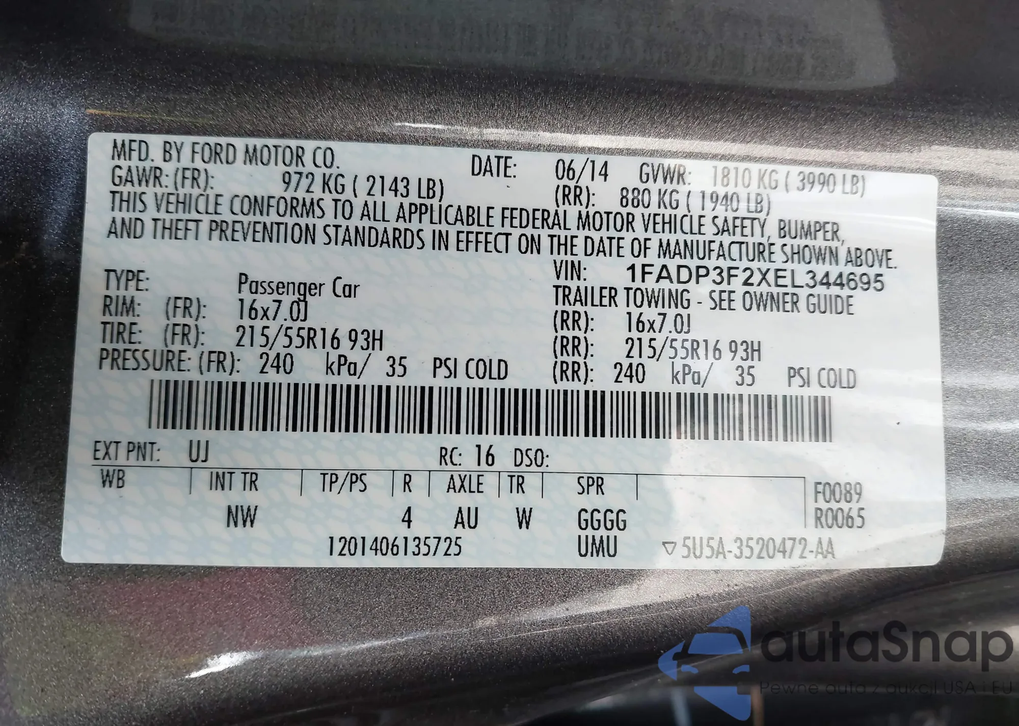LOT: 43372932 VIN: 1FADP3F2XEL344695