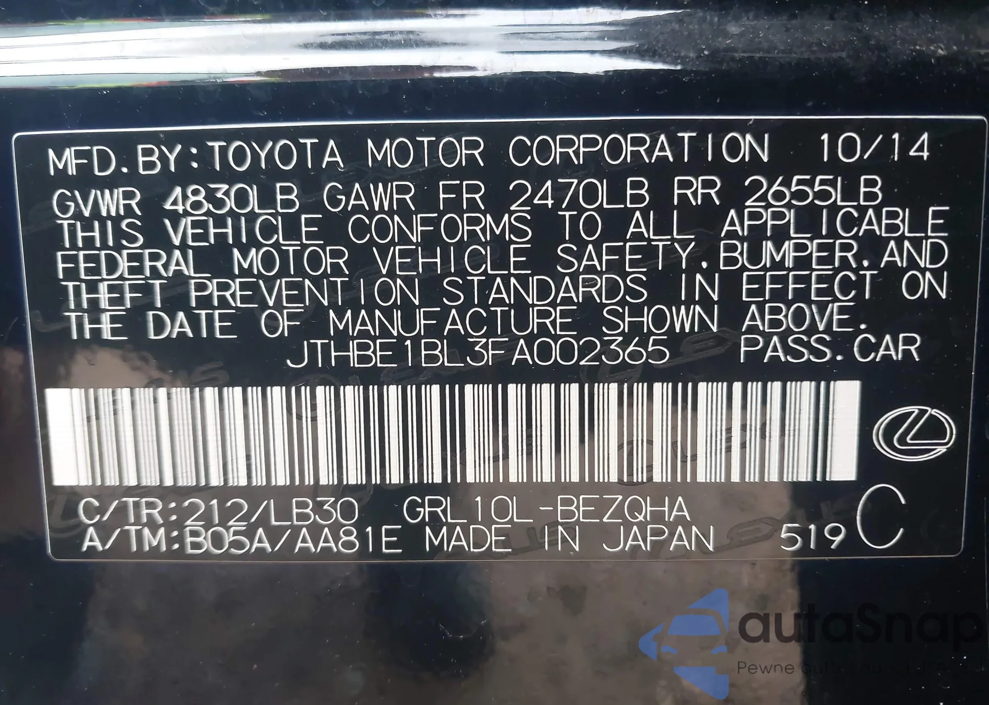 • VIN JTHBE1BL3FA002365