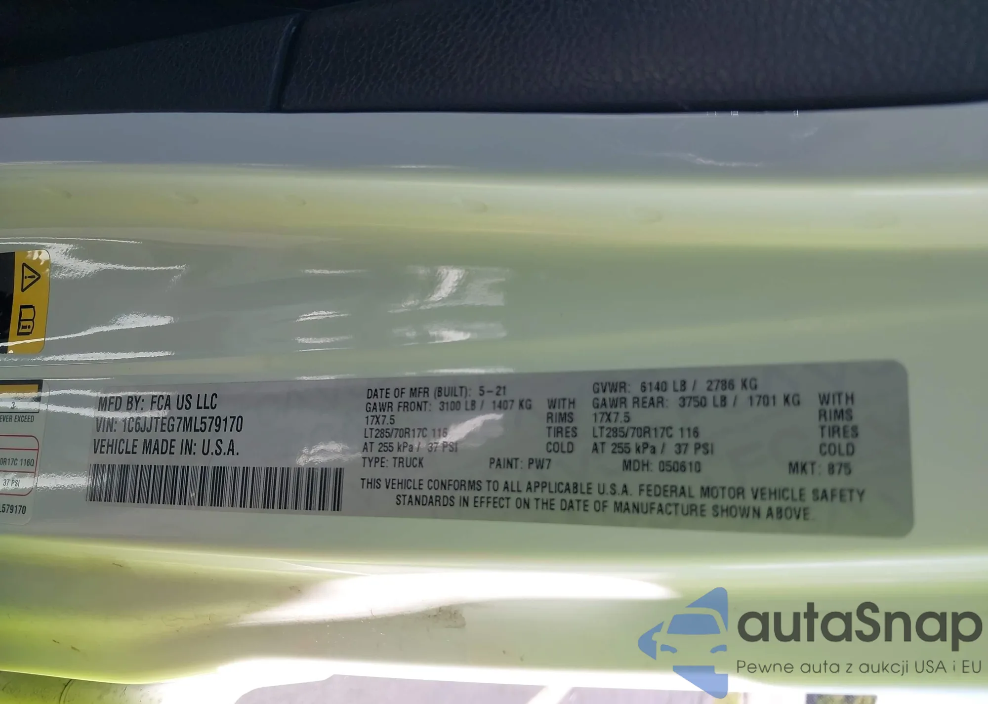 LOT: 43771442 VIN: 1C6JJTEG7ML579170