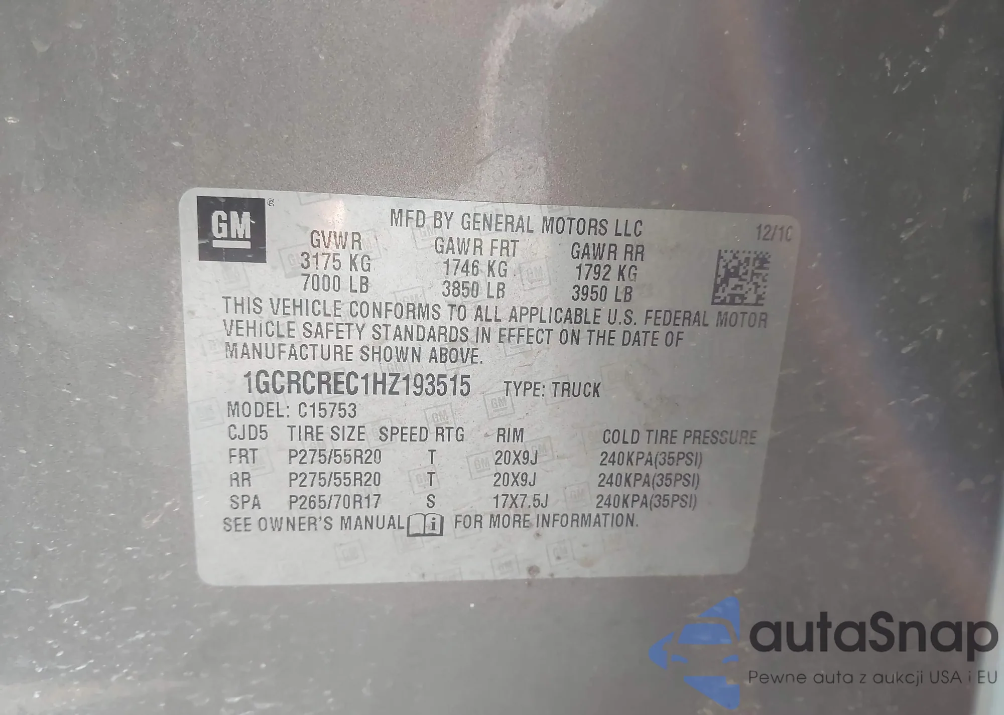 • VIN 1GCRCREC1HZ193515