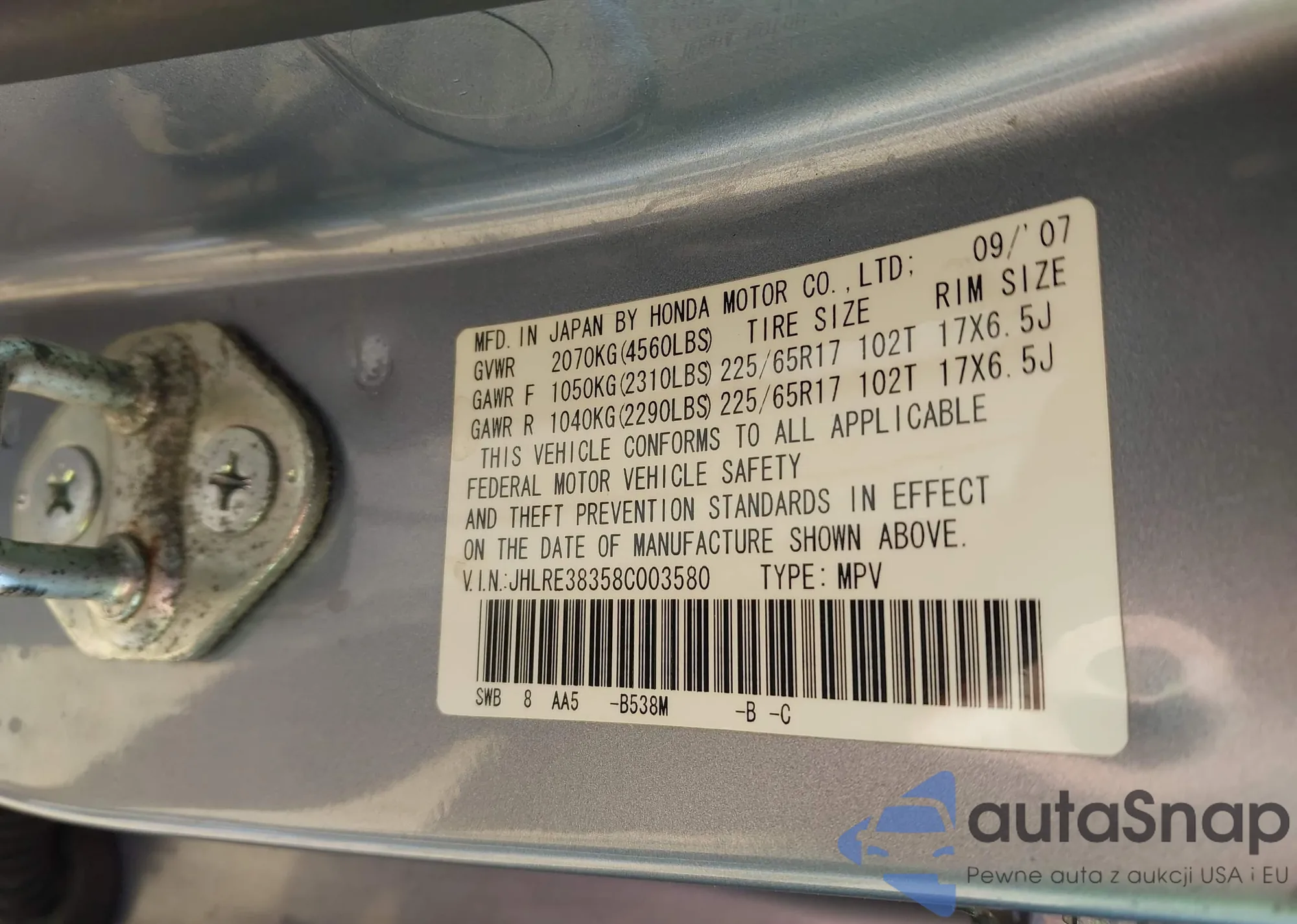 • VIN JHLRE38358C003580