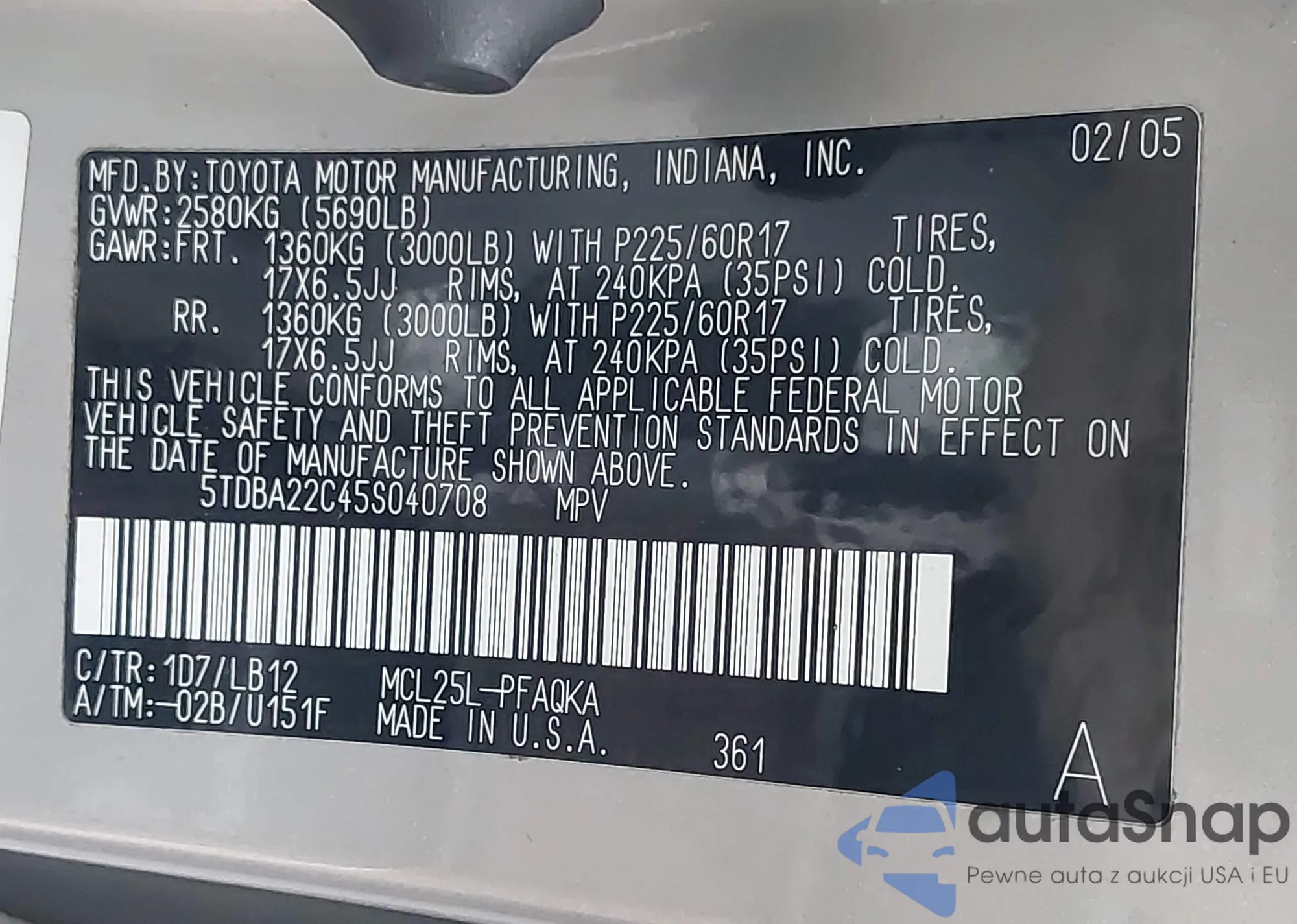 • VIN 5TDBA22C45S040708