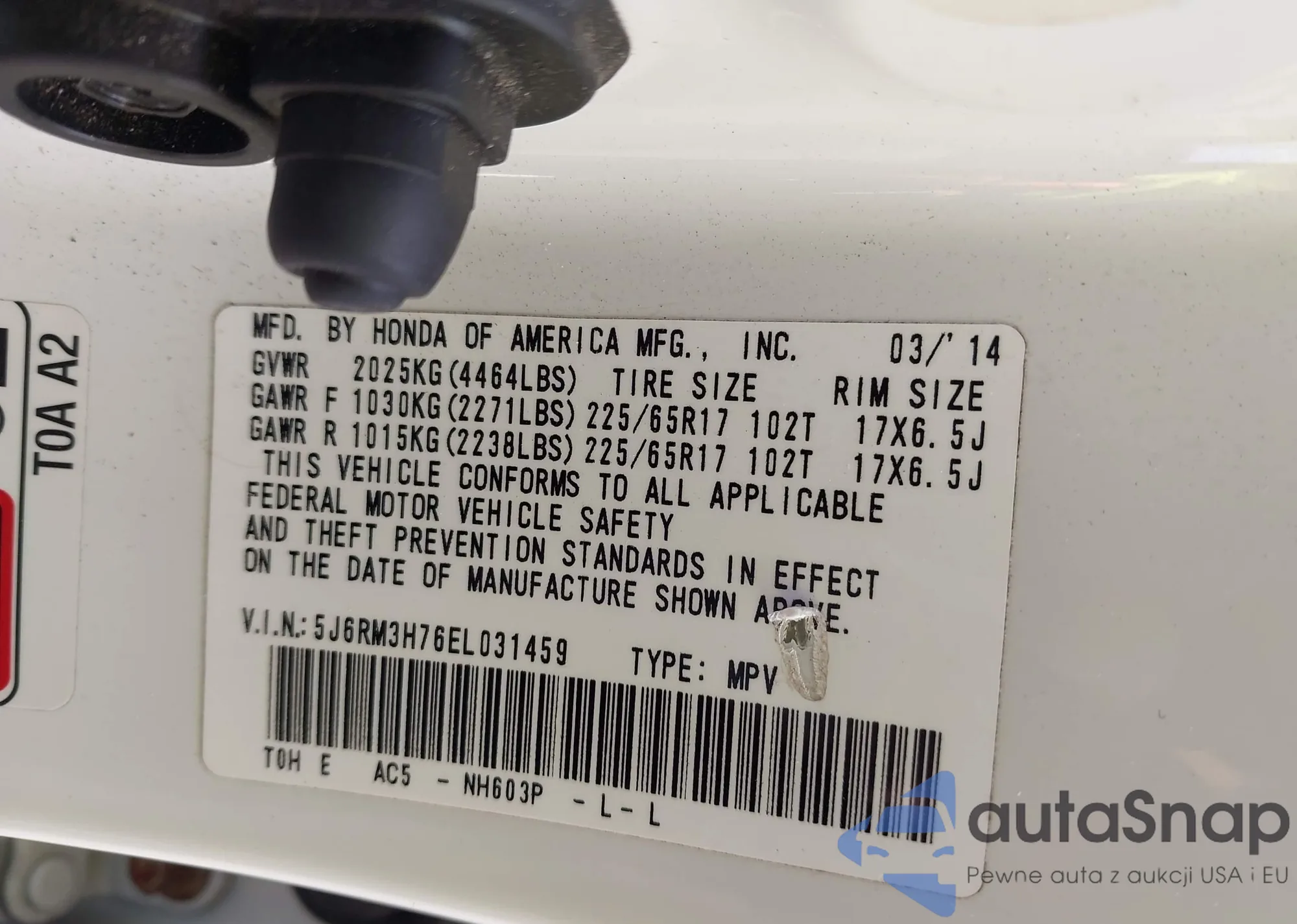 • VIN 5J6RM3H76EL031459