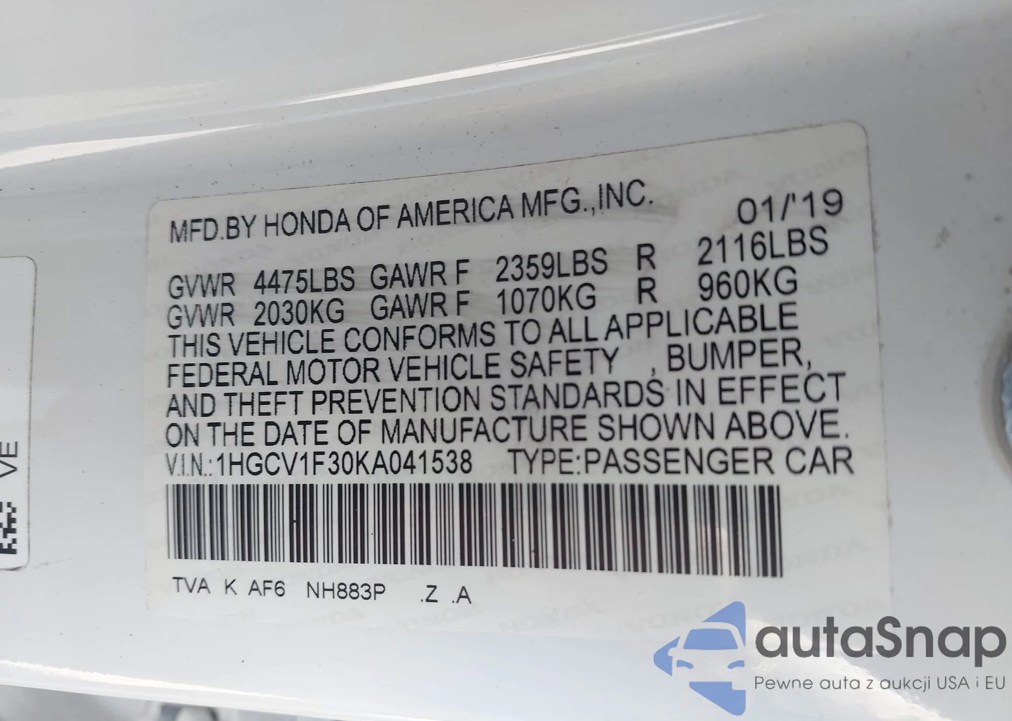 LOT: 43556381 VIN: 1HGCV1F30KA041538
