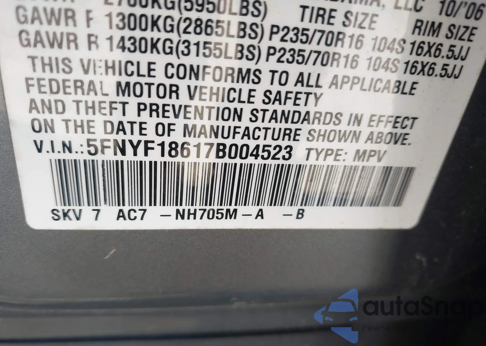LOT: 43587150 VIN: 5FNYF18617B004523
