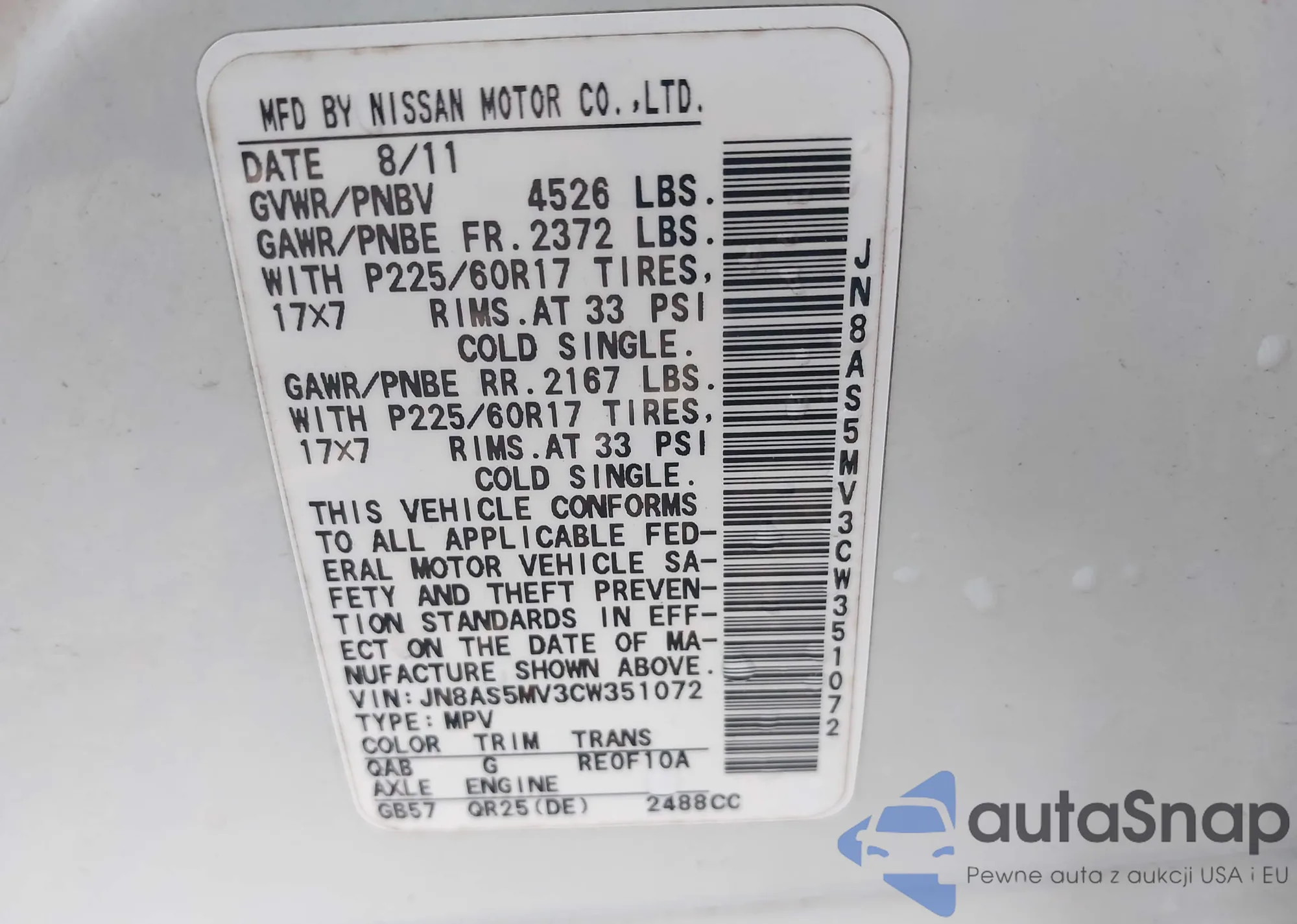 • VIN JN8AS5MV3CW351072