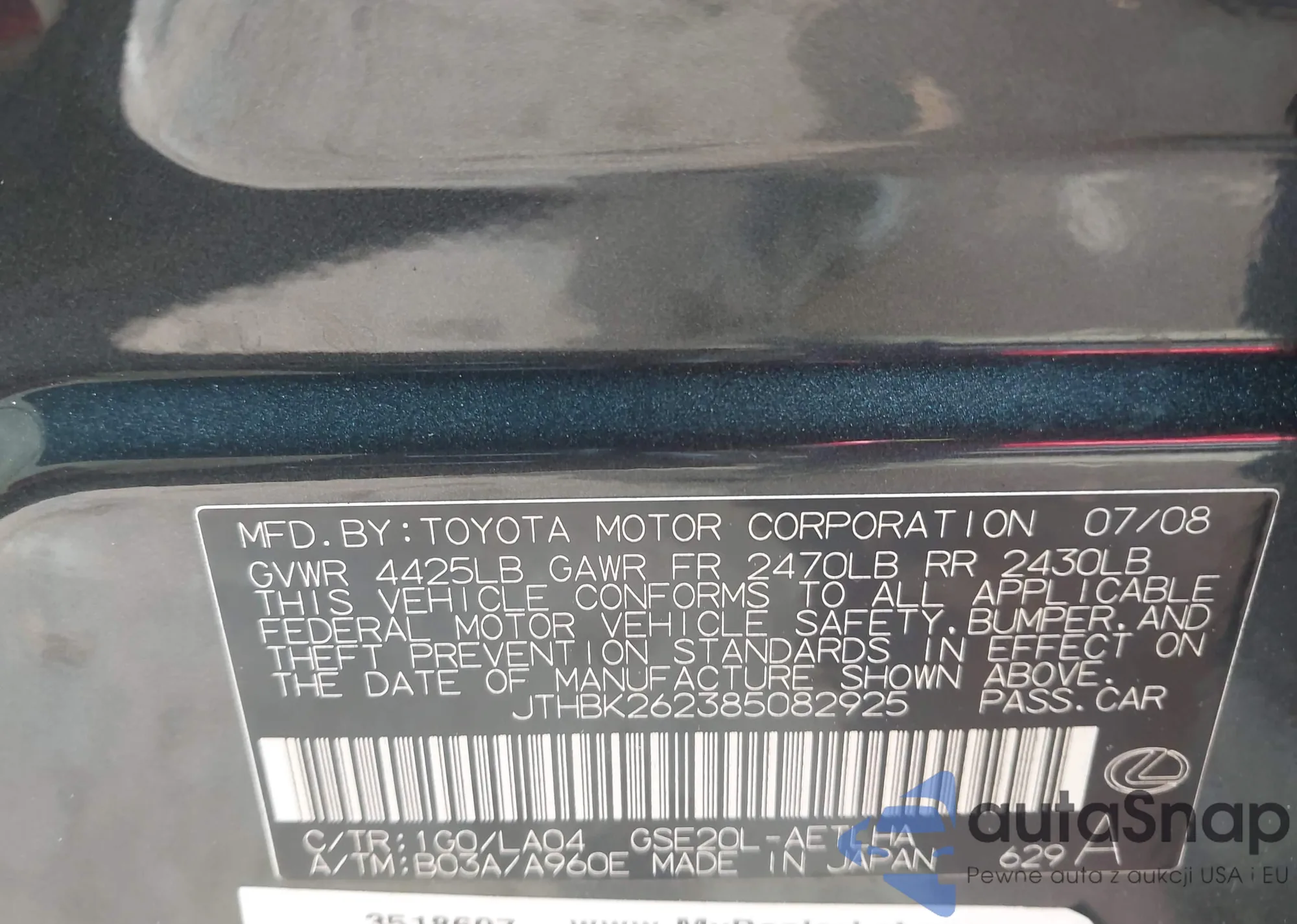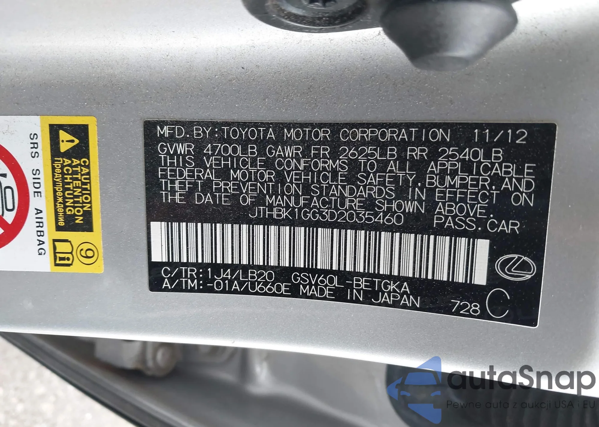 LOT: 43647704 VIN: JTHBK1GG3D2035460