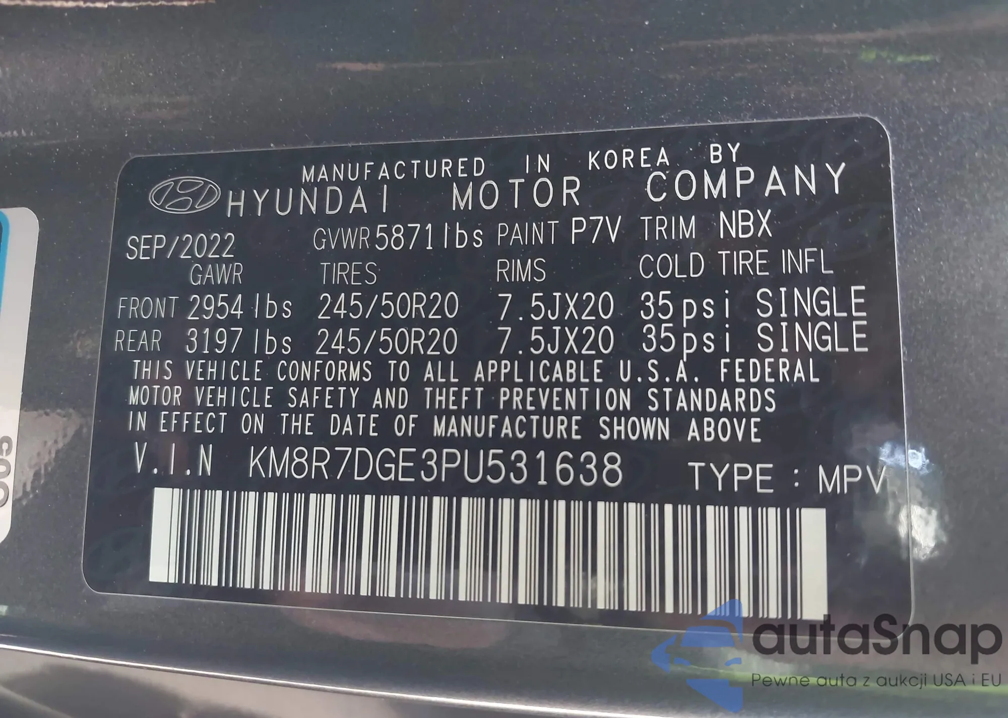 LOT: 43647915 VIN: KM8R7DGE3PU531638