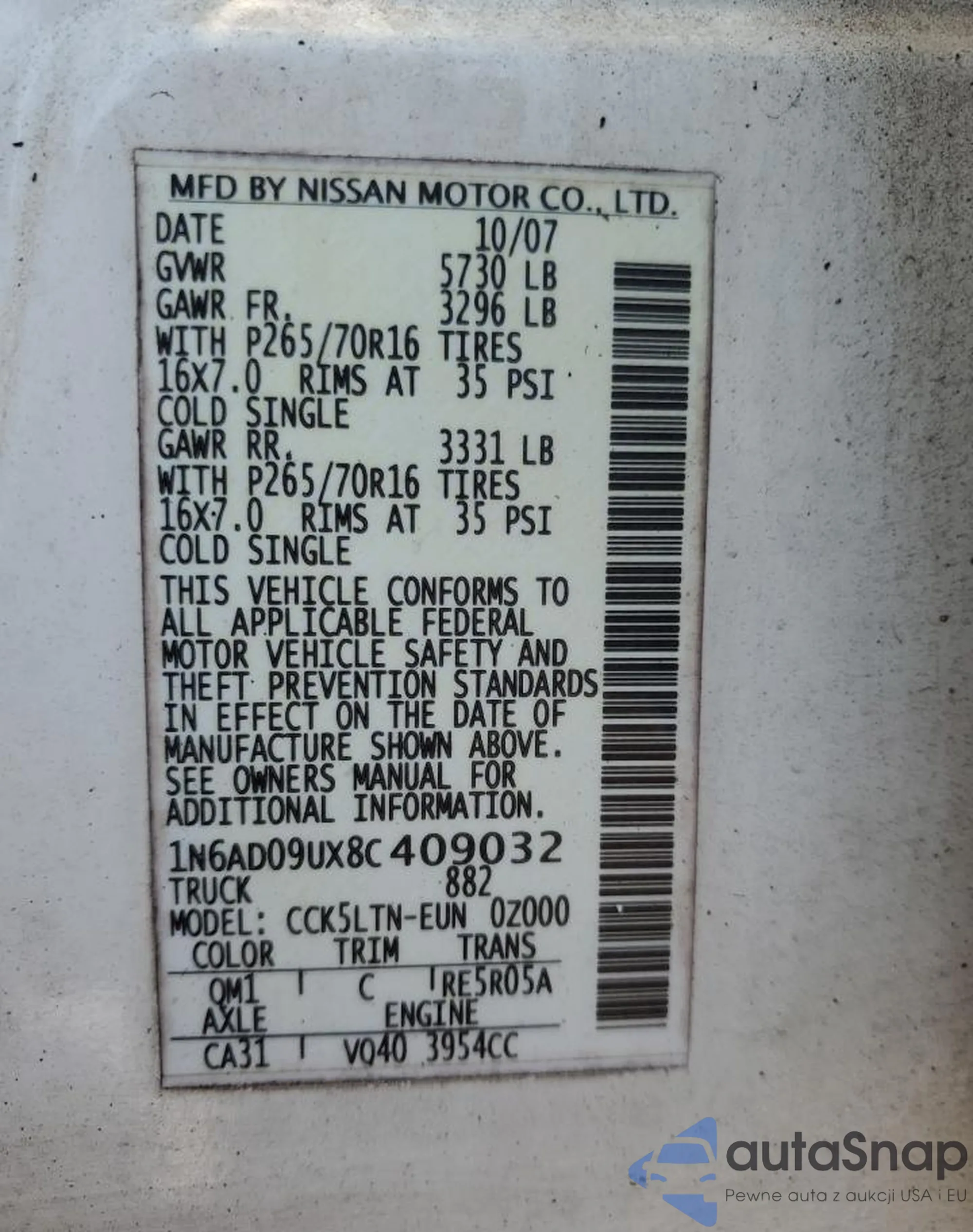 • VIN 1N6AD09UX8C409032