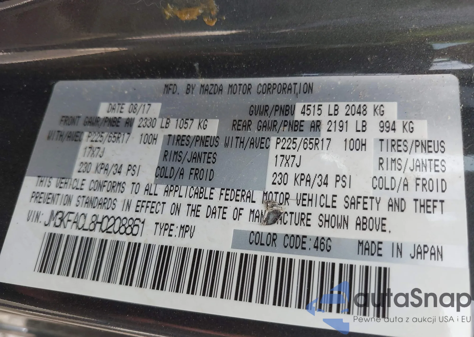 LOT: 43488911 VIN: 1FMCU9J95HUA33532