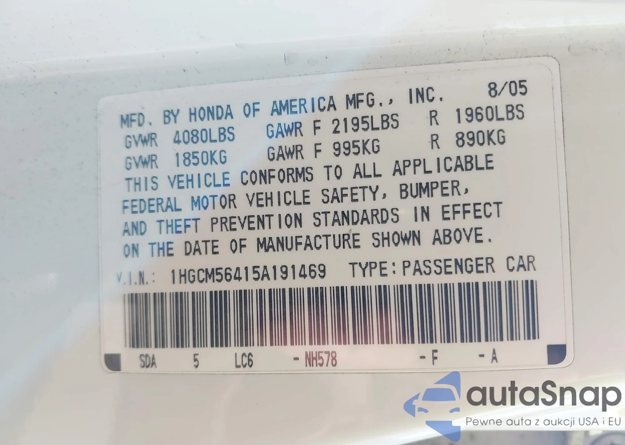 LOT: 43646085 VIN: 1HGCM56415A191469